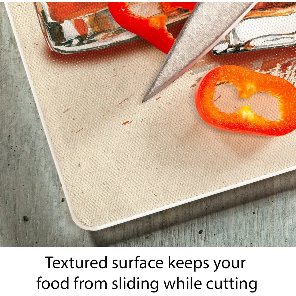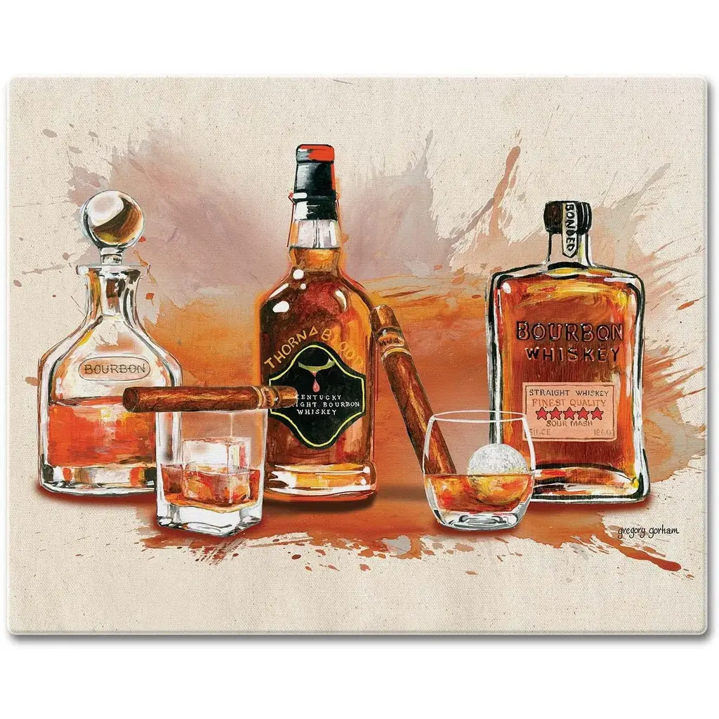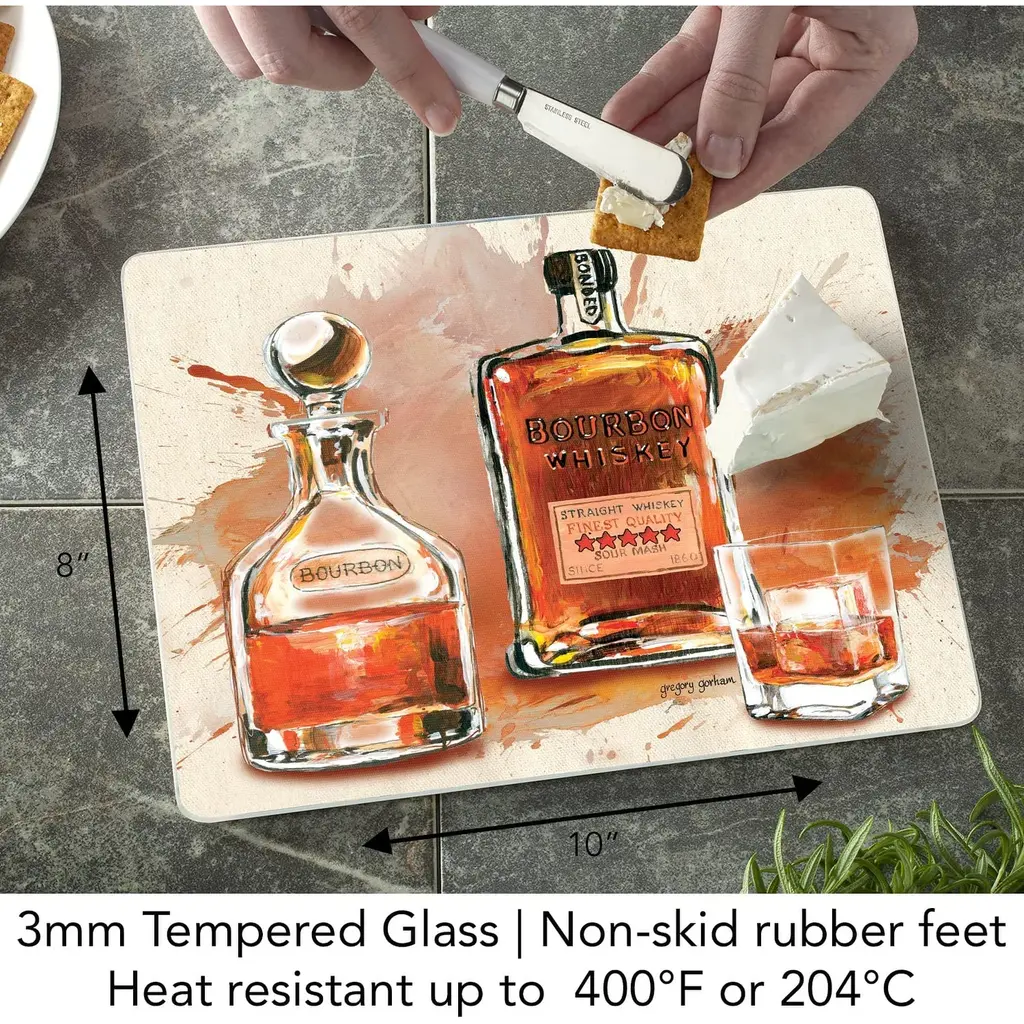 Bourbon Splash Tempered Glass Cutting Board. Perfect for prepping, carving, or serving. Features a sturdy tempered glass body. The surface is slightly textured to prevent movement of your foods while chopping and dicing. The colorful, artistic design brings a distinctive style to your kitchen or buffet table. Non-skid rubber feet on the back will hold the piece steady while protecting your countertop from scratches. Carve a roast, prep a salad, use it for happy hour entertaining, on the buffet table with wine and cheese. No kitchen should be without this versatile board, and it makes a great gift! Measures 12 by 15 inches and is dishwasher safe.