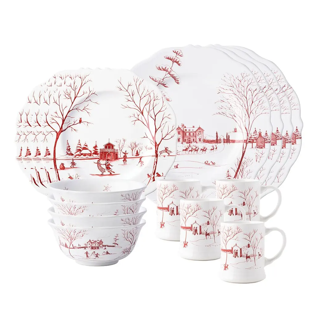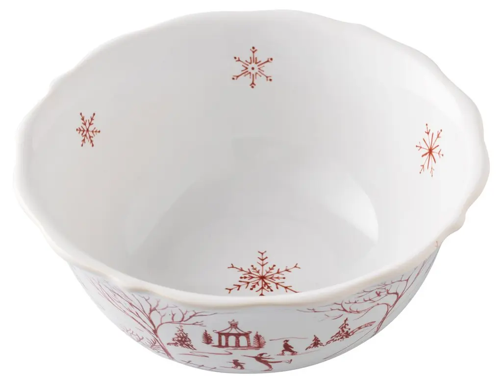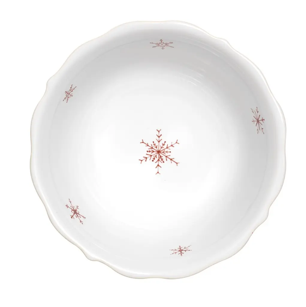 This ceramic bowl makes a festive addition to your collection with its scalloped rim and cheerful winter scene in red. Made in Portugal.