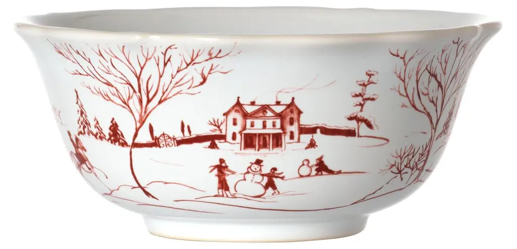 Tis the season to be jolly! This festive bowl is fit to grace any table or countertop, with its beautifully scalloped rim that puts a subtle flourish on whatever contents are within, from hearty servings of side dishes for holiday feasts to a tumble of pomegranates in the kitchen. Whimsical ruby-hued illustrations of a charming Country Estate in winter are rendered in exquisite detail, from the merry pastoral pursuits on the outside, to the banners flying on the inside.