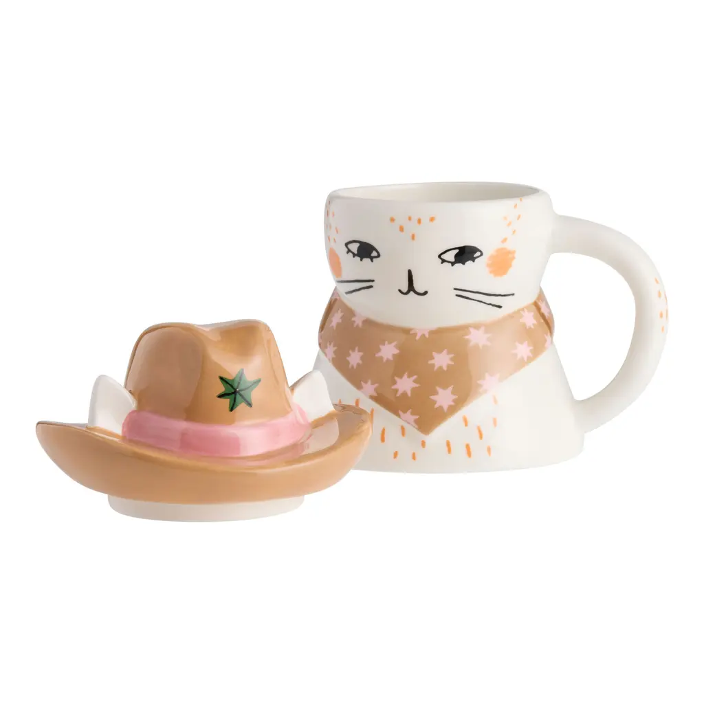 Add a dash of yee-haw energy to your morning cup of joe with our rootin' tootin' cowboy cat-shaped mug. This exclusive, tall cup is made of off-white ceramic with pink and teal accents as well as a tan bandana accessory and hat-shaped lid. World Market specializes in unique figural mugs like this fun feline, an adorable gift on any occasion.