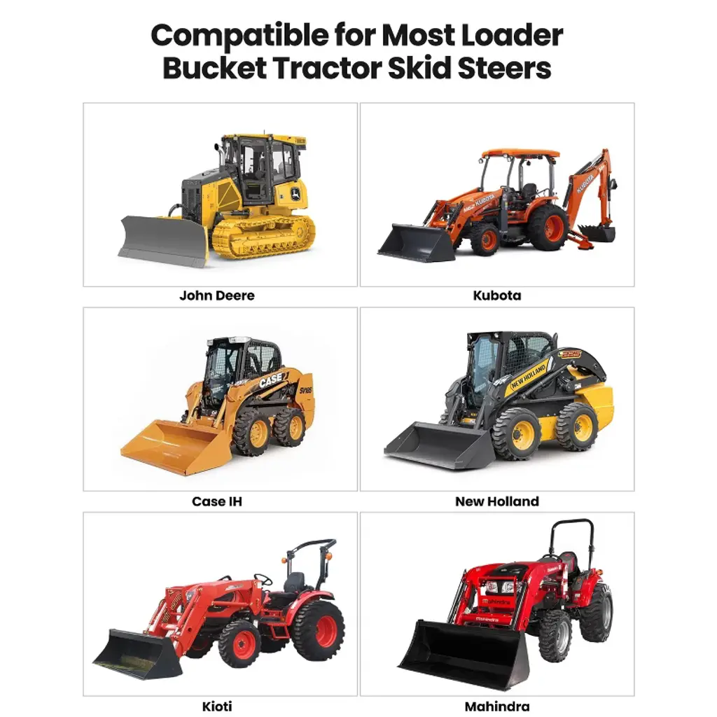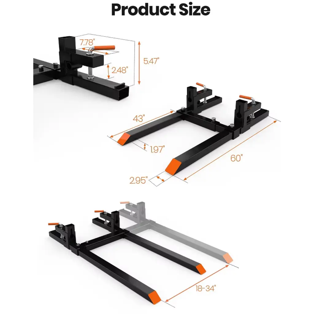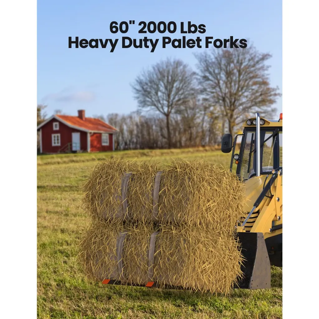 Upgrade your tractor's versatility with these professional-grade clamp-on pallet forks, available in two size and capacity configurations. The 47" model handles up to 2000lbs, while the 60" version manages 4000lb loads - both featuring an adjustable stabilizer bar for secure material handling. Constructed from reinforced high-tensile steel, these forks bolt directly to your existing bucket without welding. The universal design fits most tractor loaders and skid steers, transforming your equipment for multiple farming and landscaping tasks.