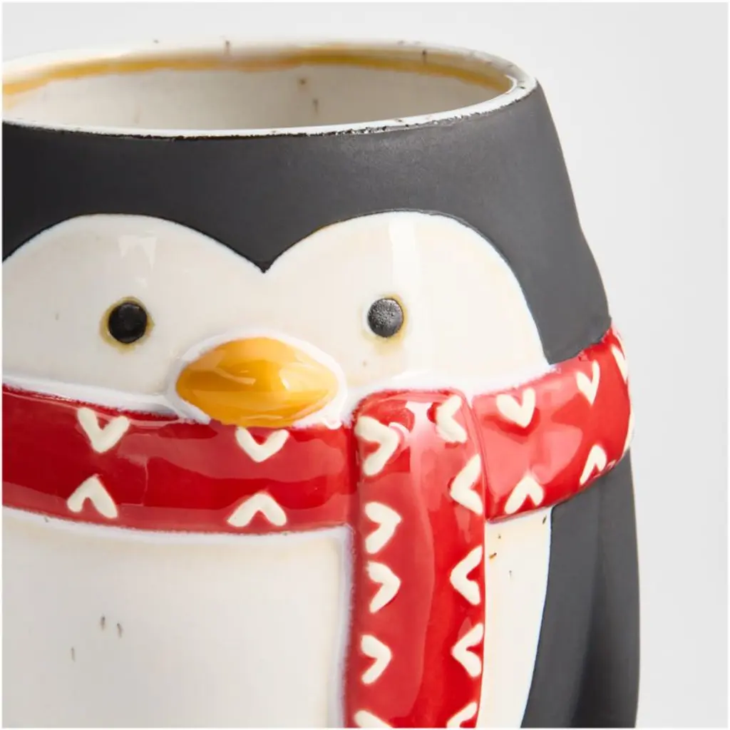 Cozy up hot cocoa or coffee with this delightful mug. Molded with dimensional features, the ceramic pengiun-shaped mug is glazed speckled white and black and detailed with a red-and-white patterned scarf. Pair this avian charmer with its companion animal mugs for a wintery menagerie.