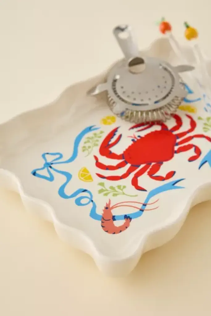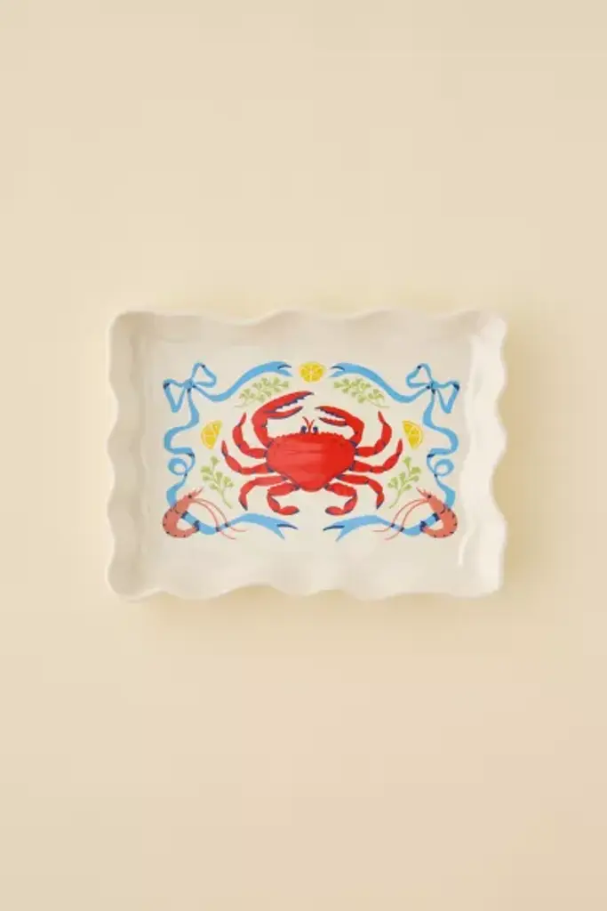 Don’t let your guests get crabby with hunger! Upgrade your dinnerware with this ceramic serving platter featuring wavy edges with a crab accenting the center of the tray. Available exclusively at Urban Outfitters. **Features** \- Crab Icon Wavy Serving Platter from UO Home \- Ceramic serving dish with wavy edges \- Crab icon at the center of the dish \- Easy to clean - just pop it in the dishwasher \- UO exclusive **Content + Care** \- 100% Stoneware \- Food safe \- Dishwasher safe; not microwave or oven safe \- Imported **Size** \- Dimensions: 11"l x 7.9"w x 1.6"h \- Weight: 2 lbs
