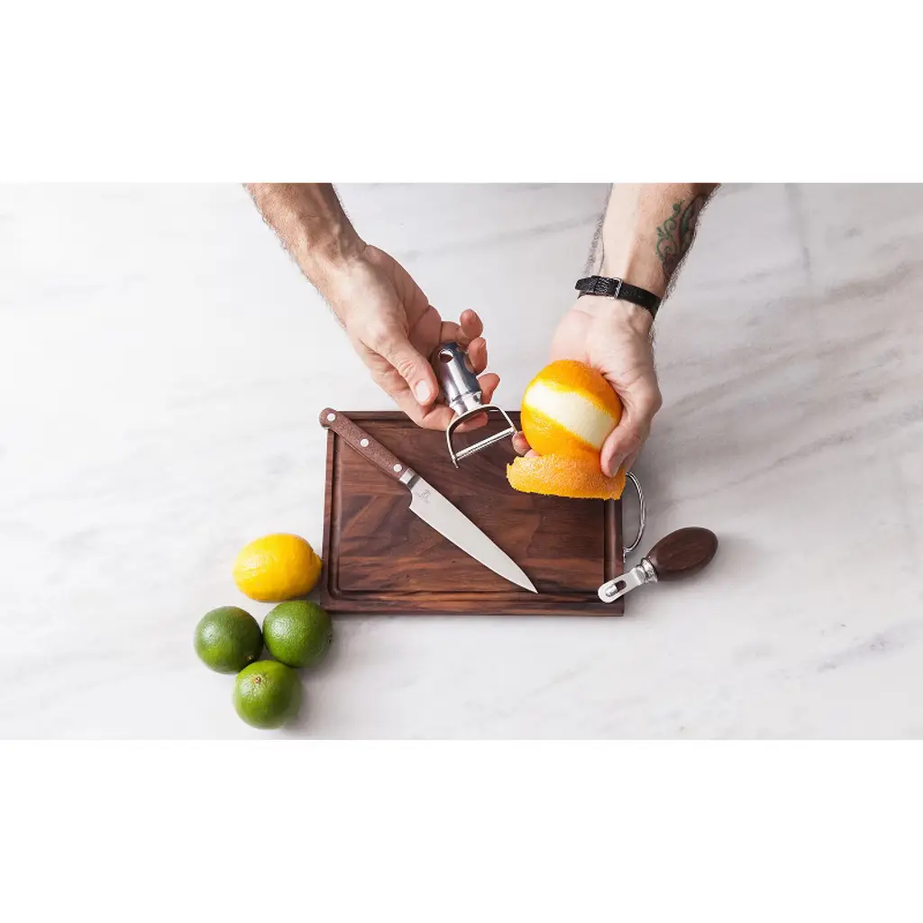 Crafthouse by Fortessa is a comprehensive barware collection designed by World Champion bartender, Charles Joly, for the aspiring home bartender and professional alike. This zest-infusing set includes: Peeler the professionals tool for making garnishes. A Channel Knife the specialty blade for creating artful twists and unlocking flavorful oils. A Bar Knife the go-to knife for preparing citrus, fruits, herbs and spices. And of course, a Bar Board sturdy, rich black walnut, and the ideal size for your cocktail prep.