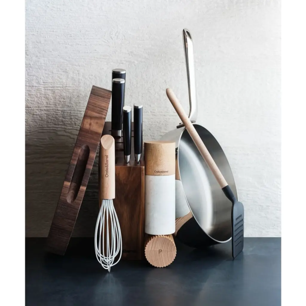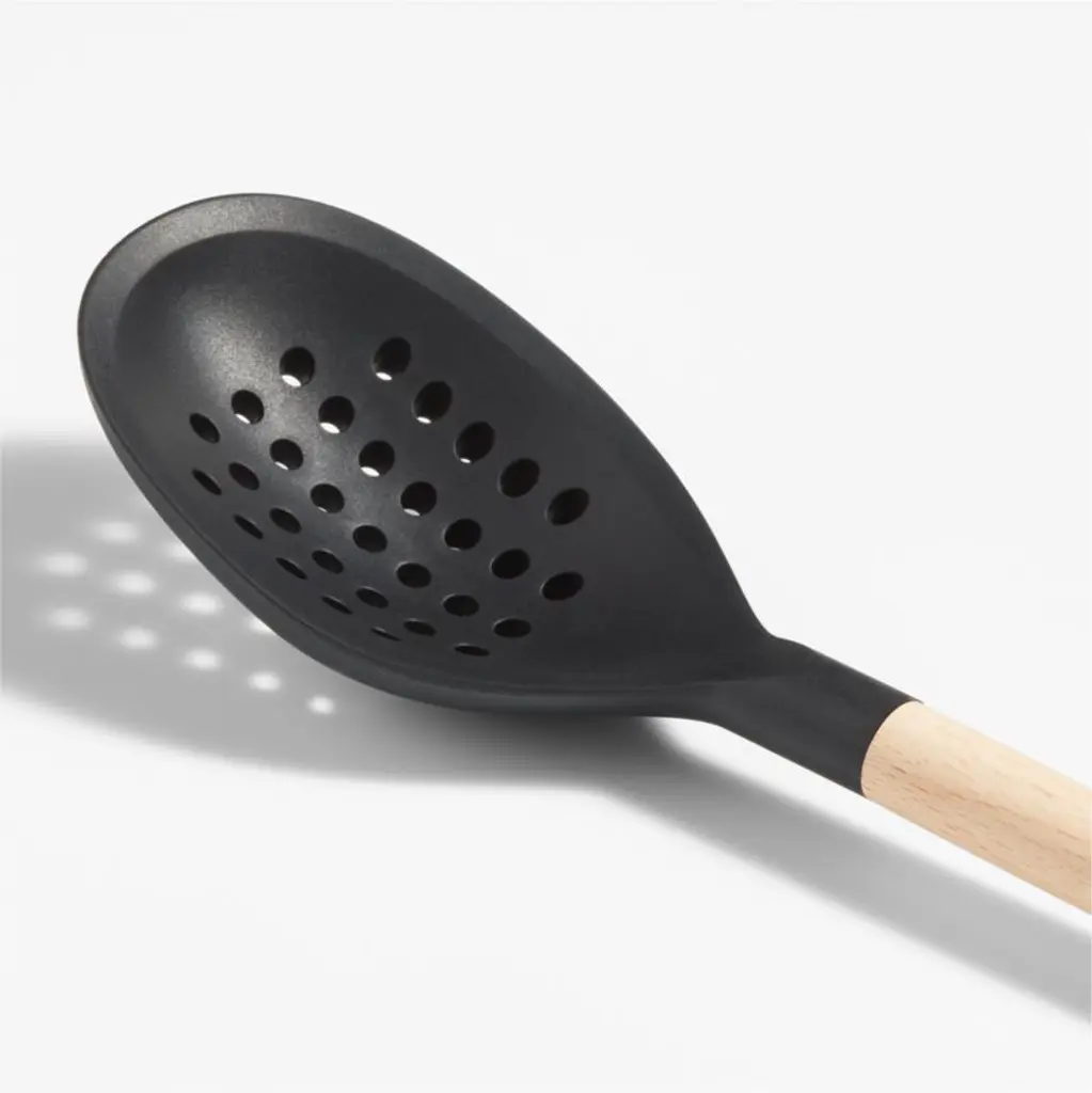 Stir, scoop and serve dumplings, pasta and peas with our signature black silicone and wood deep slotted spoon. Constructed with a nylon core for strength, the double-capacity spoon is generously sized to scoop and serve with perforations that allow liquids to drain away. Soft-touch silicone won't damage non-stick pans and resists stains, scratches and heat up to 600 degrees. Natural beechwood shapes a sleek cylindrical handle for a sturdy grip and a warm, classic look, and a refined beveled edge finishes the handle with dynamic detail. Combine the black deep slotted spoon with the other exquisitely proportioned utensils in our exclusive Crate & Barrel collection for a well-outfitted workspace that's up to any cooking challenge.Direct from our design team to your kitchen, the sophisticated assortment in our signature The Kitchen by Crate line combines beautiful simplicity and peerless performance. From initial sketches to rigorous testing, every expertly designed product in this kitchen collection meets our standards, and yours.View all "The Kitchen by Crate" collection
