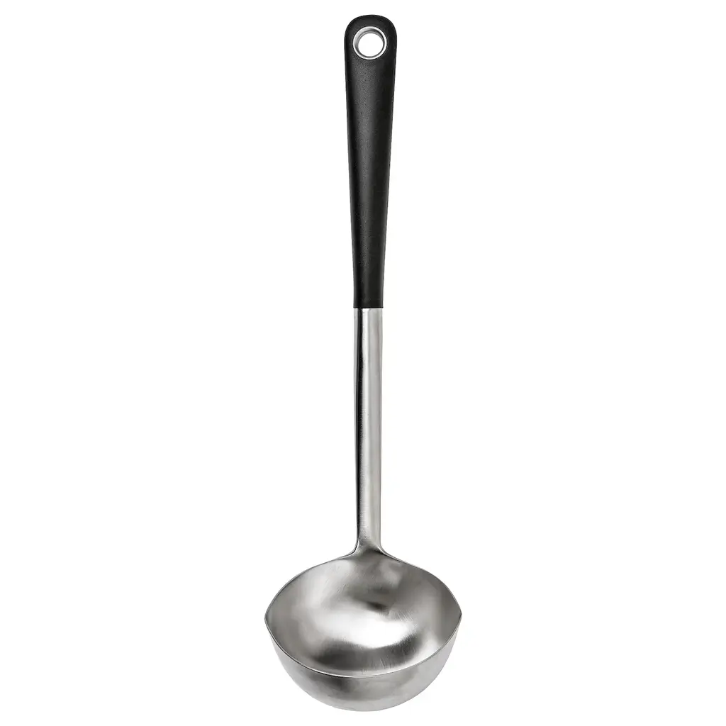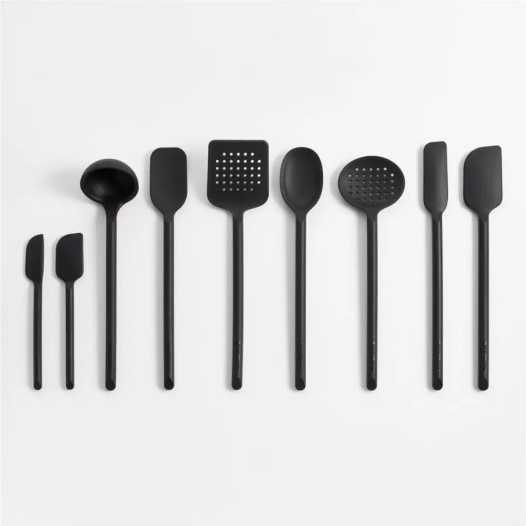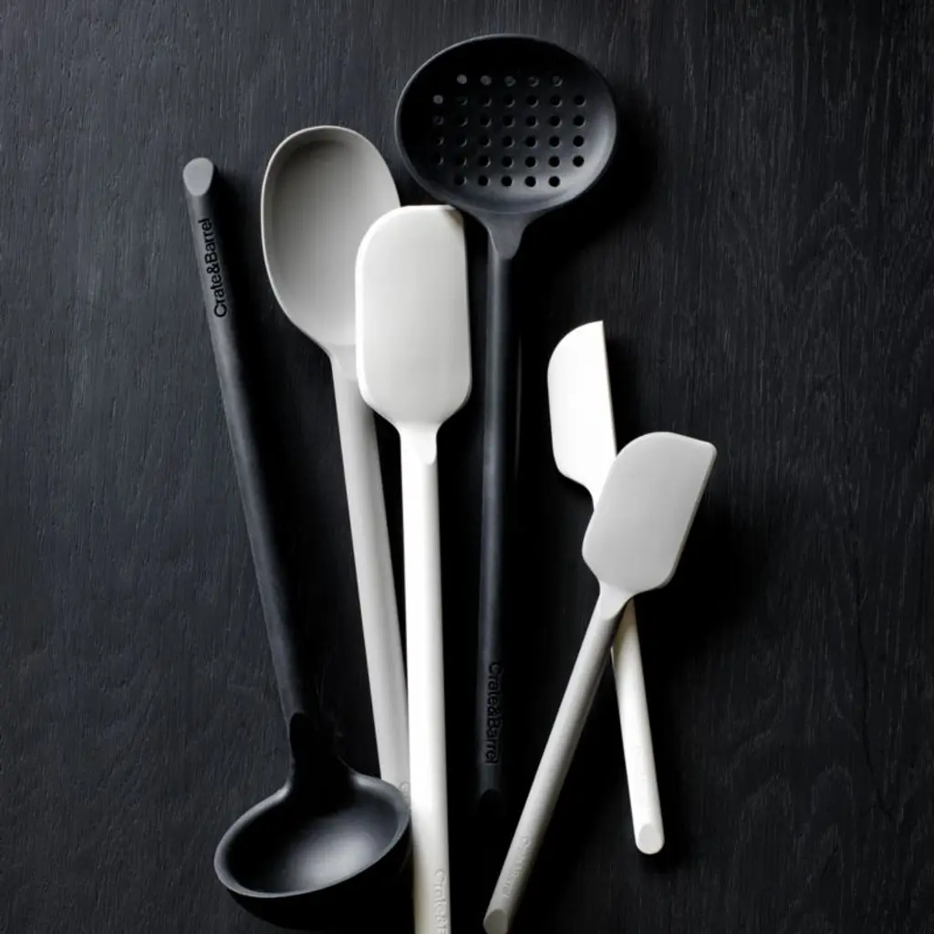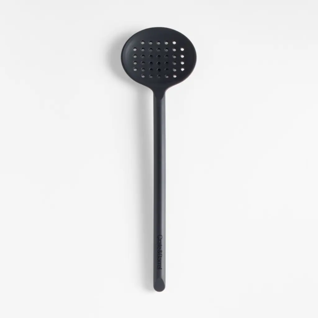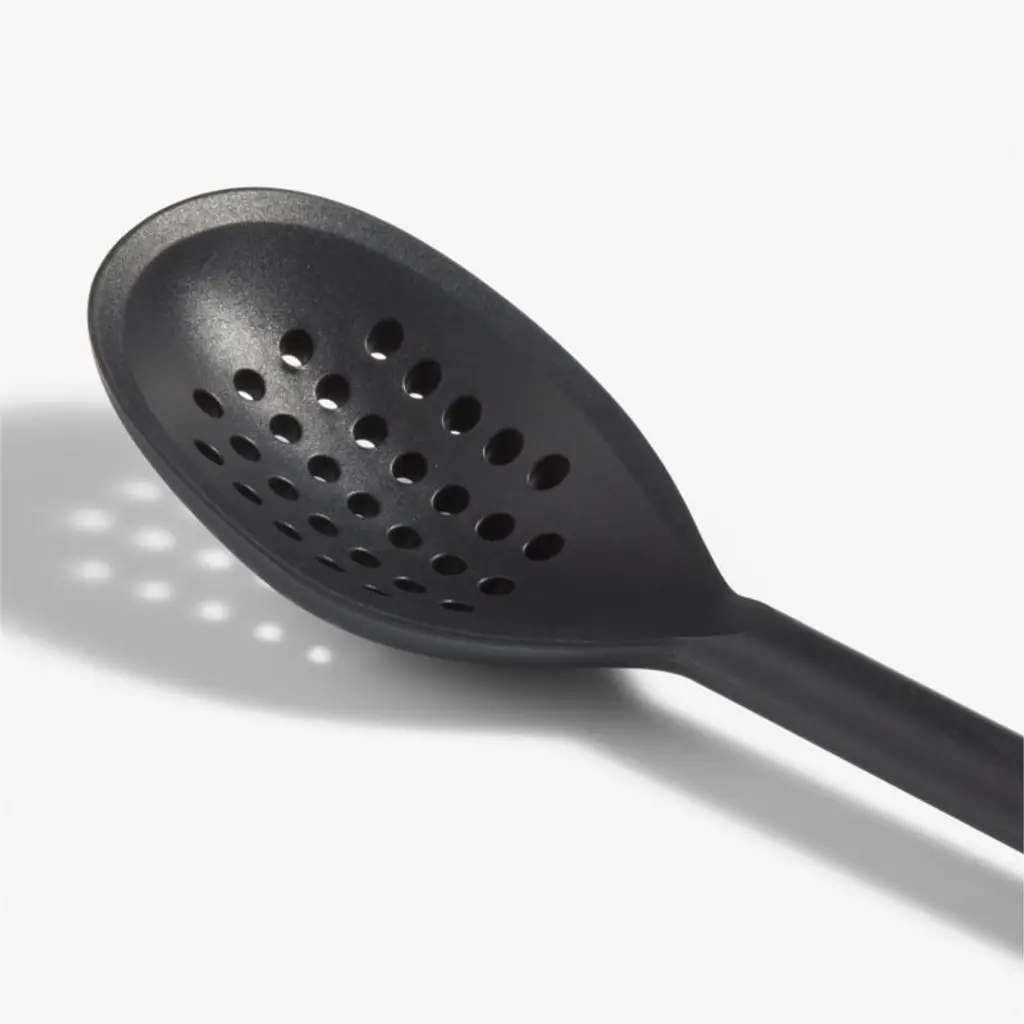 Stir, scoop and serve dumplings, pasta and peas with our signature black silicone deep slotted spoon. Constructed with a nylon core for strength, the double-capacity spoon is generously sized to scoop and serve with perforations that allow liquids to drain away. Soft-touch silicone won't damage non-stick pans and resists stains, scratches and heat up to 600 degrees. We love the way the refined beveled edge finishes the elongated handle with a dynamic detail. Combine the dishwasher-safe deep slotted spoon with the other exquisitely proportioned utensils in our exclusive Crate & Barrel collection for a well-outfitted workspace that's up to any cooking challenge.Direct from our design team to your kitchen, the sophisticated assortment in our signature The Kitchen by Crate line combines beautiful simplicity and peerless performance. From initial sketches to rigorous testing, every expertly designed product in this kitchen collection meets our standards, and yours.View all "The Kitchen by Crate" collection