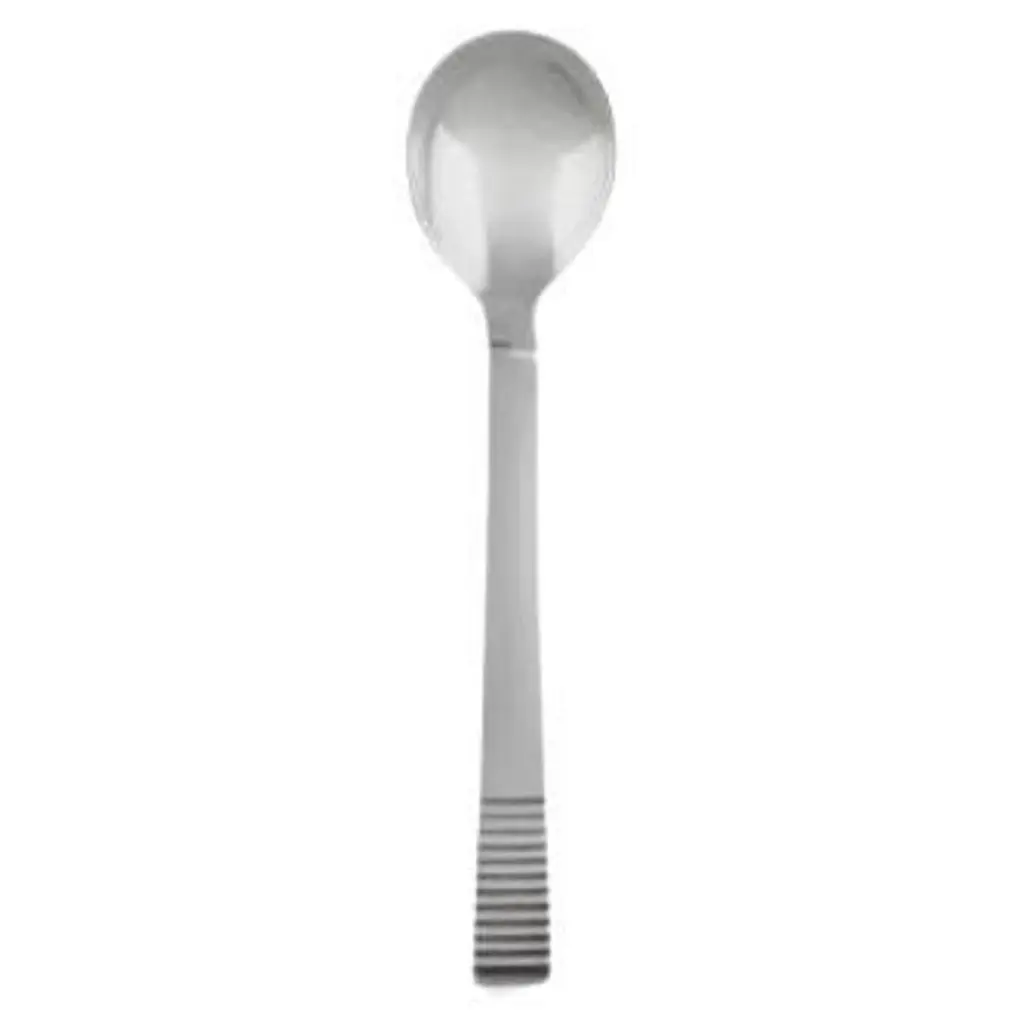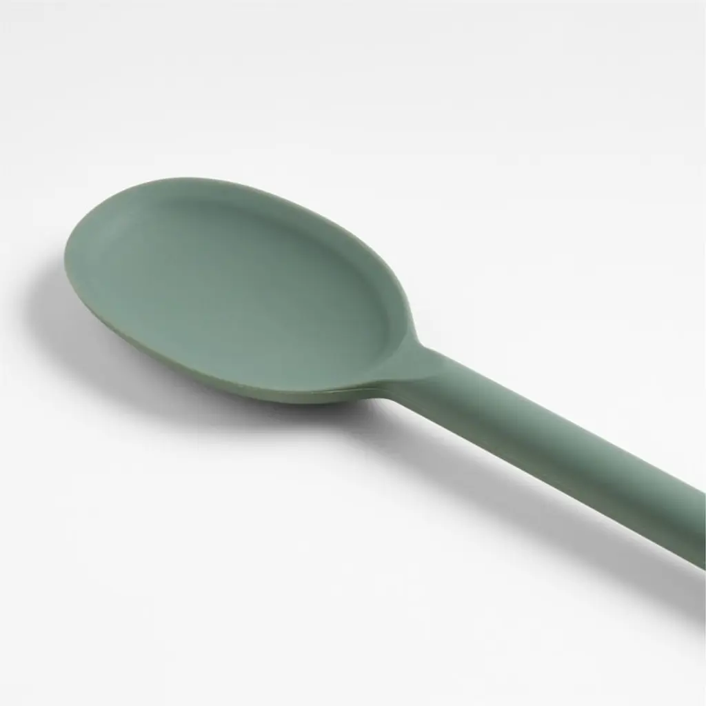 Stir, scoop and serve with our signature silicone spoon in a fresh grey-green hue inspired by thyme. Constructed with a nylon core for strength, the utensil ably stirs the thickest sauces, doughs and battersor folds the most delicate meringues. Its flexible, tapered edges scrape the bowl, blender or pan clean. The soft-touch silicone won't damage non-stick cookware, resists scratches and tolerates heat up to 500°F. We love the way the refined beveled edge finishes the elongated handle with a dynamic detail. Combine the dishwasher-safe spoon with the other exquisitely proportioned utensils in our exclusive Crate & Barrel collection for a well-outfitted workspace that's up to any cooking challenge.