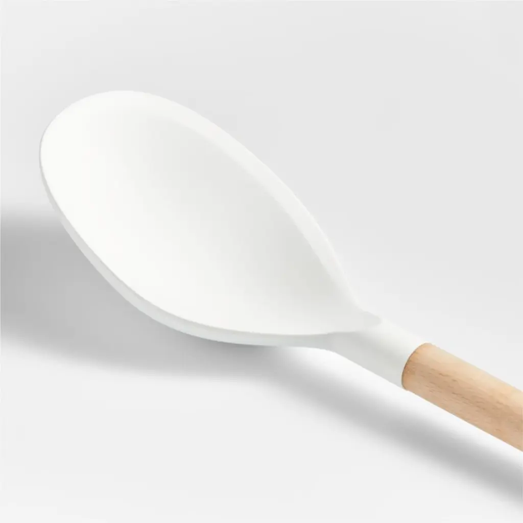 Stir, scoop and serve with our signature white silicone and wood deep spoon. Constructed with a nylon core for strength, the double-capacity spoon is generously sized to scoop and serve. Its flexible, tapered edges scrape the bowl, blender or pan perfectly clean, and soft-touch silicone won't damage non-stick cookware and resists stains, scratches and heat up to 600 degrees. Natural beechwood shapes a cylindrical handle for a sturdy grip and a warm, classic look, and a refined beveled edge finishes the handle with dynamic detail. Combine the white deep spoon with the other exquisitely proportioned utensils in our exclusive Crate & Barrel collection for a well-outfitted workspace that's up to any cooking challenge.Direct from our design team to your kitchen, the sophisticated assortment in our signature The Kitchen by Crate line combines beautiful simplicity and peerless performance. From initial sketches to rigorous testing, every expertly designed product in this kitchen collection meets our standards, and yours.View all "The Kitchen by Crate" collection