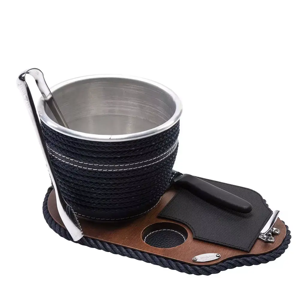 Preparing long drinks has never been more stylish with this elegant bar set including a steel ice-bucket (ø 16 cm) covered on the outside with cream ropes interrupted by a central leather band, aluminum tongs, a teak wood base, a rubber mat, and a knife. The sturdy tray features an irregular perimeter fully outlined by a thicker rope matching in color, enhancing the overall nautical allure.