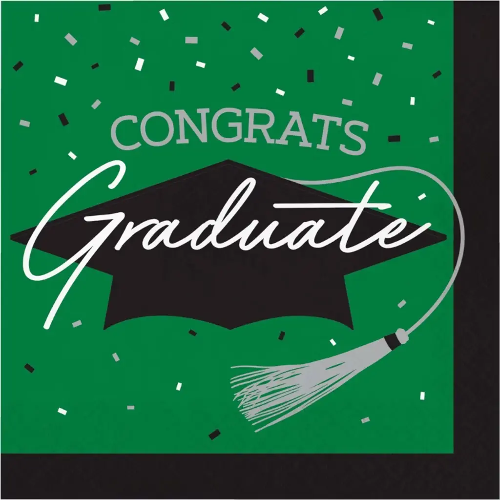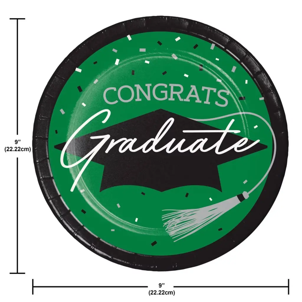 Each Green Graduation Plates and Napkins Kit includes: 36 Green Graduation Dinner Plates (9") and 72 Green Graduation Dinner Napkins (6.5"). The Green Graduation Plates and Napkins Kit serves up to 36 guests with the included paper plates and napkins, which feature a green, black, and white color scheme; a graduation cap; and "Congrats Graduate" text. Snag this kit to celebrate any high school, college, or other graduation and match school colors. Paper plates and napkins help make party clean up easy and will give you more time to spend with your guests. Browse the coordinating graduation party supplies and start party planning!