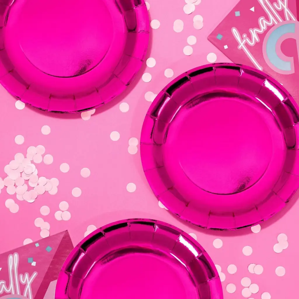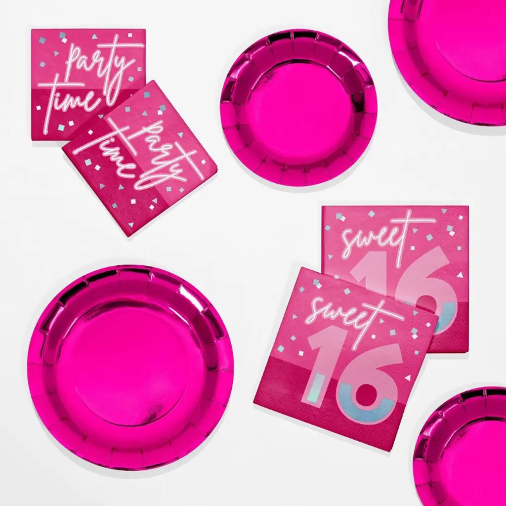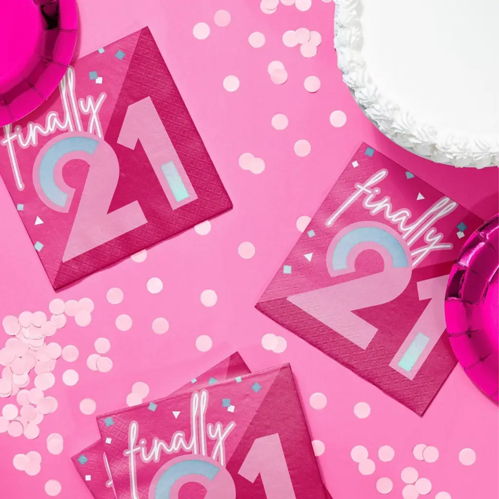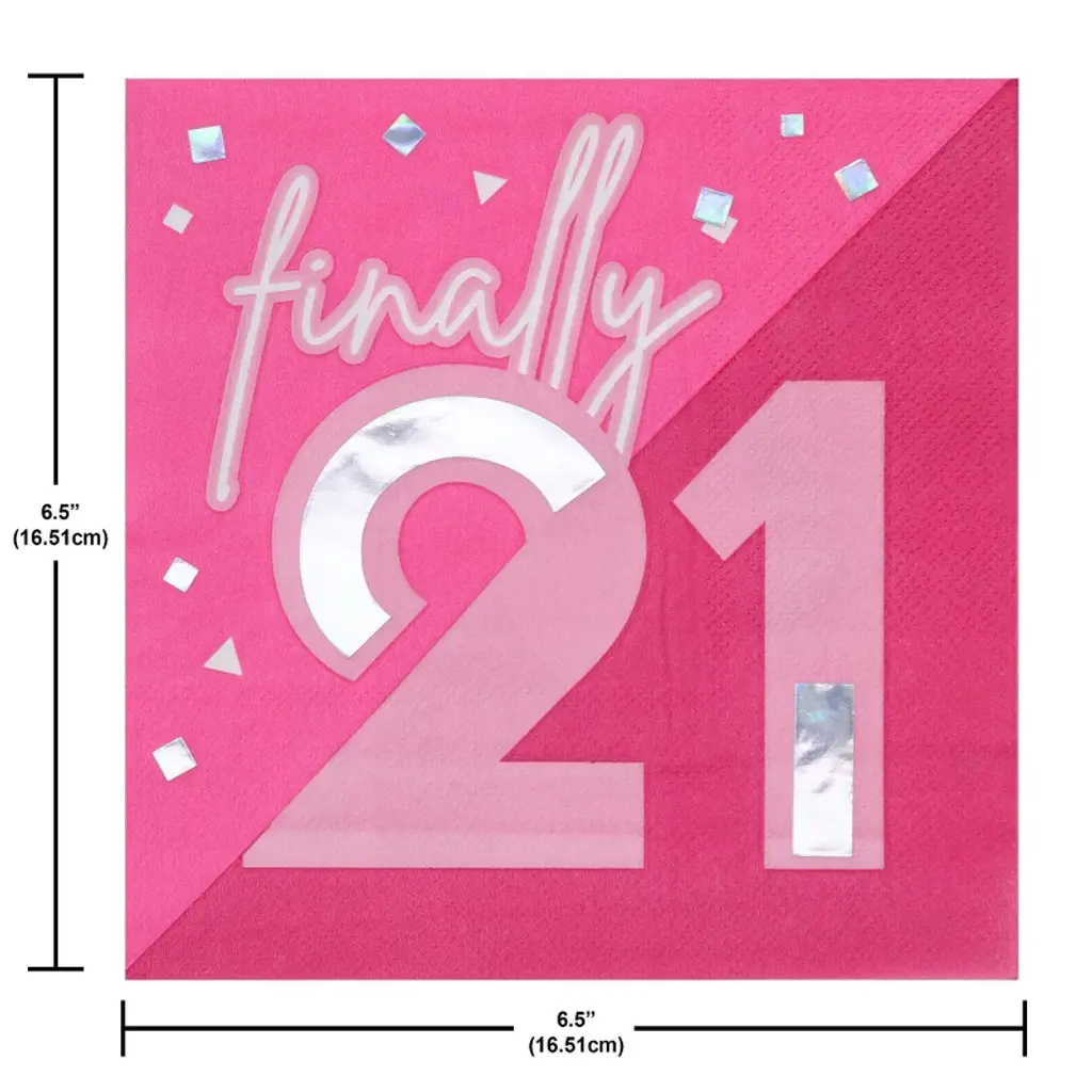 This Hot Pink Foil 21st Birthday Plates and Napkins Set is perfect for hosting a stylish 21st birthday party! This kit serves 16 guests and comes with 9" dinner plates and 6.5" dinner napkins so you can dish out delicious food in a trendy way. The hot pink foil plates will easily fit slices of cake, cookies, pie, and the dinner napkins say "Finally 21." This kit is a great way to bring a pink party to life and celebrate a milestone birthday. Hosting a trendy celebration has never been easier with this complete set!