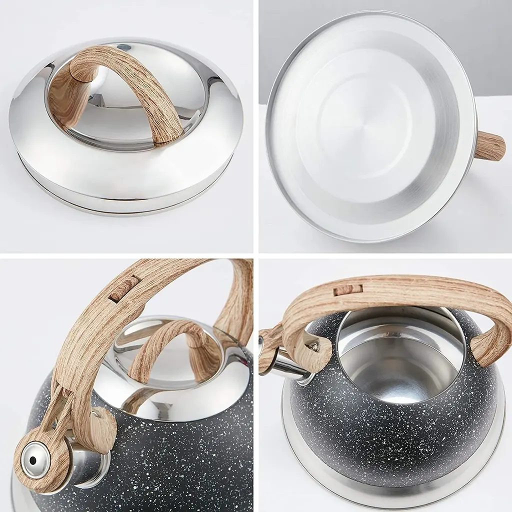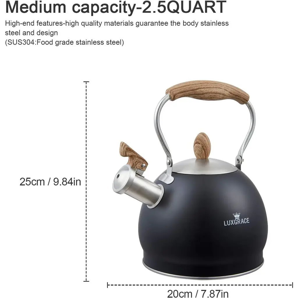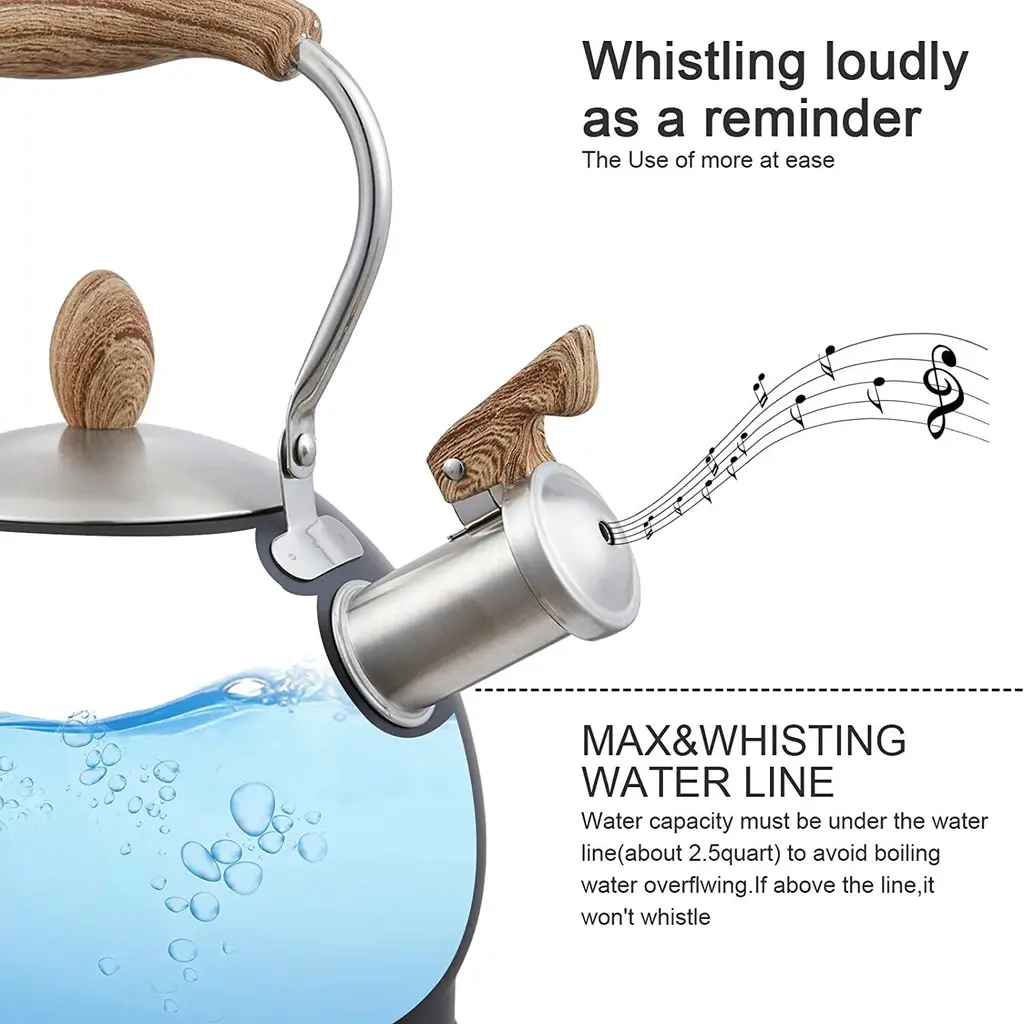 This 2.6 Quarts whistling stainless steel stovetop tea kettle is crafted of high quality stainless steel. Whistles when boiling, can be used on gas, electric, induction, halogen, and radiant stovetops. The tea kettle heats up quickly and retains heat well. Encapsulated bottom provides even heat distribution. Convenient trigger mechanism allows for the safe and easy pour. Removable lid for easy filling and convenient one finger flip spout for easy and safe pouring.The powder coating finish on the kettle body, this sophisticated design tea pot is also perfect embellishment for your kitchen.Features:Material: Stainless steelCapacity: 2.6 QuartWhistle: YesHeat Proof HandleStainless Steel SpoutStove Type Compatibility: Gas; Electric; Induction; Halogen, and Radiant StovetopsFill water both through the spout or remove the lid to fill waterCaution:Clean the kettle before use. DO NOT heat the empty kettle, it could be very dangerous When use on a gas stove, DO NOT let the flame burn the kettle body, better keep flame under the kettle bottom. We do not recommend fill water above the spout, the whistle doesn't work and it adds the risk of overflow when the water boils. Although the handle is heat resist, we still recommend to wait 5-10 seconds before you lift the kettle or use a potholder.