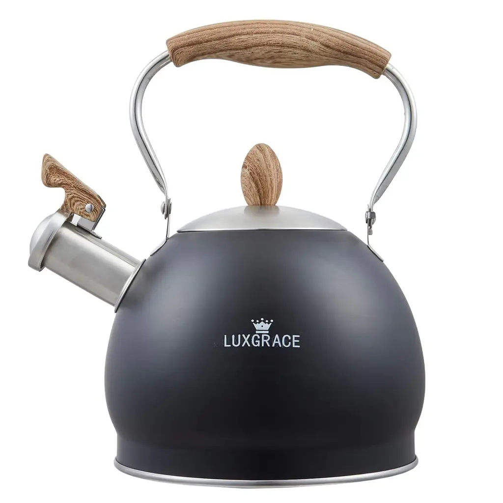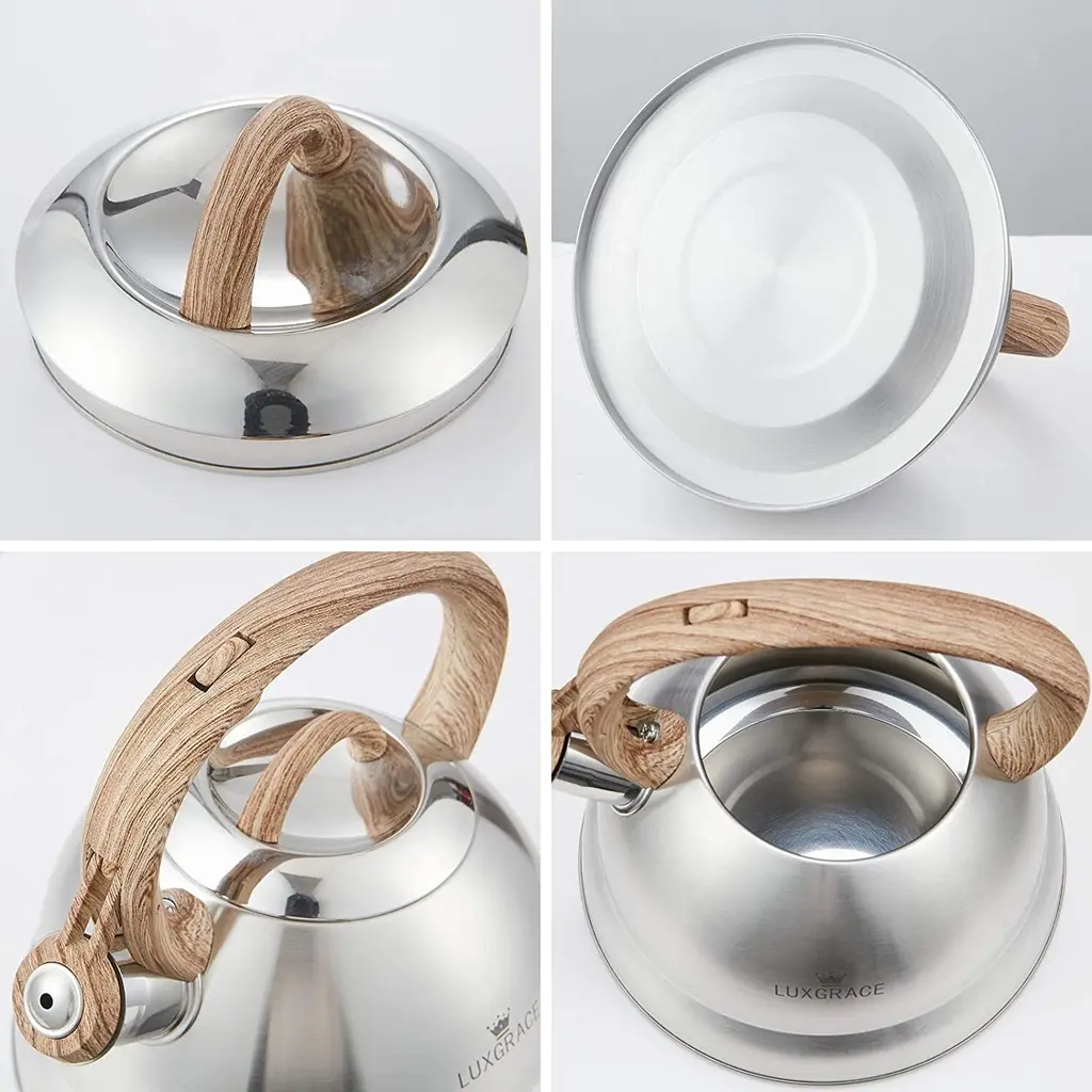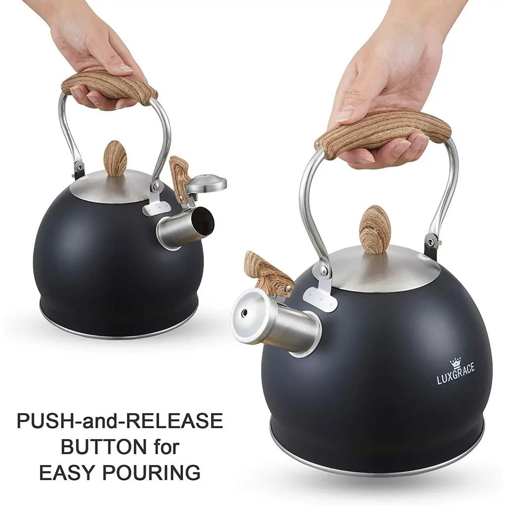 This 2.6 Quarts whistling stainless steel stovetop tea kettle is crafted of high quality stainless steel. Whistles when boiling, can be used on gas, electric, induction, halogen, and radiant stovetops. The tea kettle heats up quickly and retains heat well. Encapsulated bottom provides even heat distribution. Convenient trigger mechanism allows for the safe and easy pour. Removable lid for easy filling and convenient one finger flip spout for easy and safe pouring.The powder coating finish on the kettle body, this sophisticated design tea pot is also perfect embellishment for your kitchen.Features:Material: Stainless steelCapacity: 2.6 QuartWhistle: YesHeat Proof HandleStainless Steel SpoutStove Type Compatibility: Gas; Electric; Induction; Halogen, and Radiant StovetopsFill water both through the spout or remove the lid to fill waterCaution:Clean the kettle before use. DO NOT heat the empty kettle, it could be very dangerous When use on a gas stove, DO NOT let the flame burn the kettle body, better keep flame under the kettle bottom. We do not recommend fill water above the spout, the whistle doesn't work and it adds the risk of overflow when the water boils. Although the handle is heat resist, we still recommend to wait 5-10 seconds before you lift the kettle or use a potholder.
