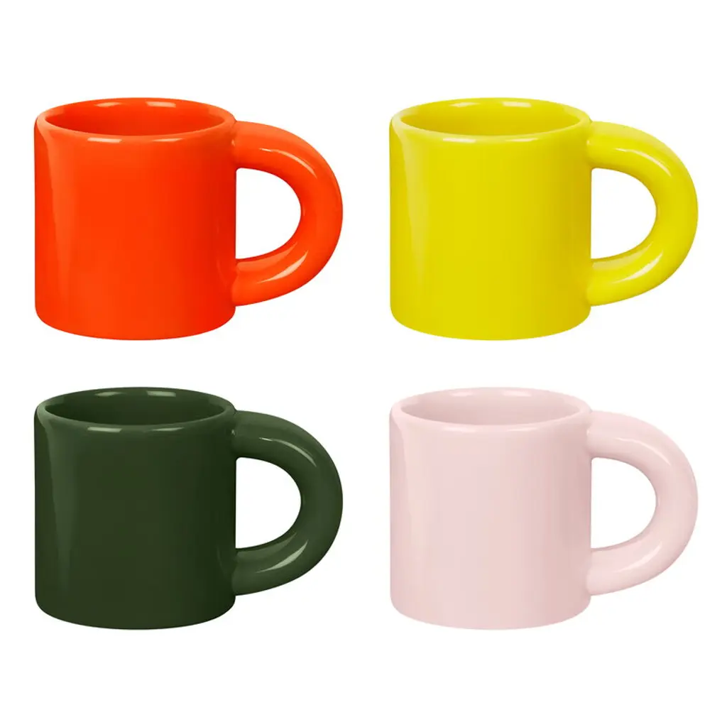 MoMA Exclusive: Cream, sugar and a touch of whimsy. These Creative Mugs and Espresso Cups bring a Memphis vibe to your coffee breaks with their colors and unusually shaped handles. Crafted from porcelain, each mug or cup is in a different upbeat color with a contrast-color handle, each in a different shape. Choose from a set of four mugs and a set of six espresso cups. Each set is sold separately. Dishwasher- and microwave-safe. Mugs: 3.5h x 4.7w x 3"d, 12ozEspresso Cups: 2.3h x 3.5w x 2.3"d, 3.4oz
