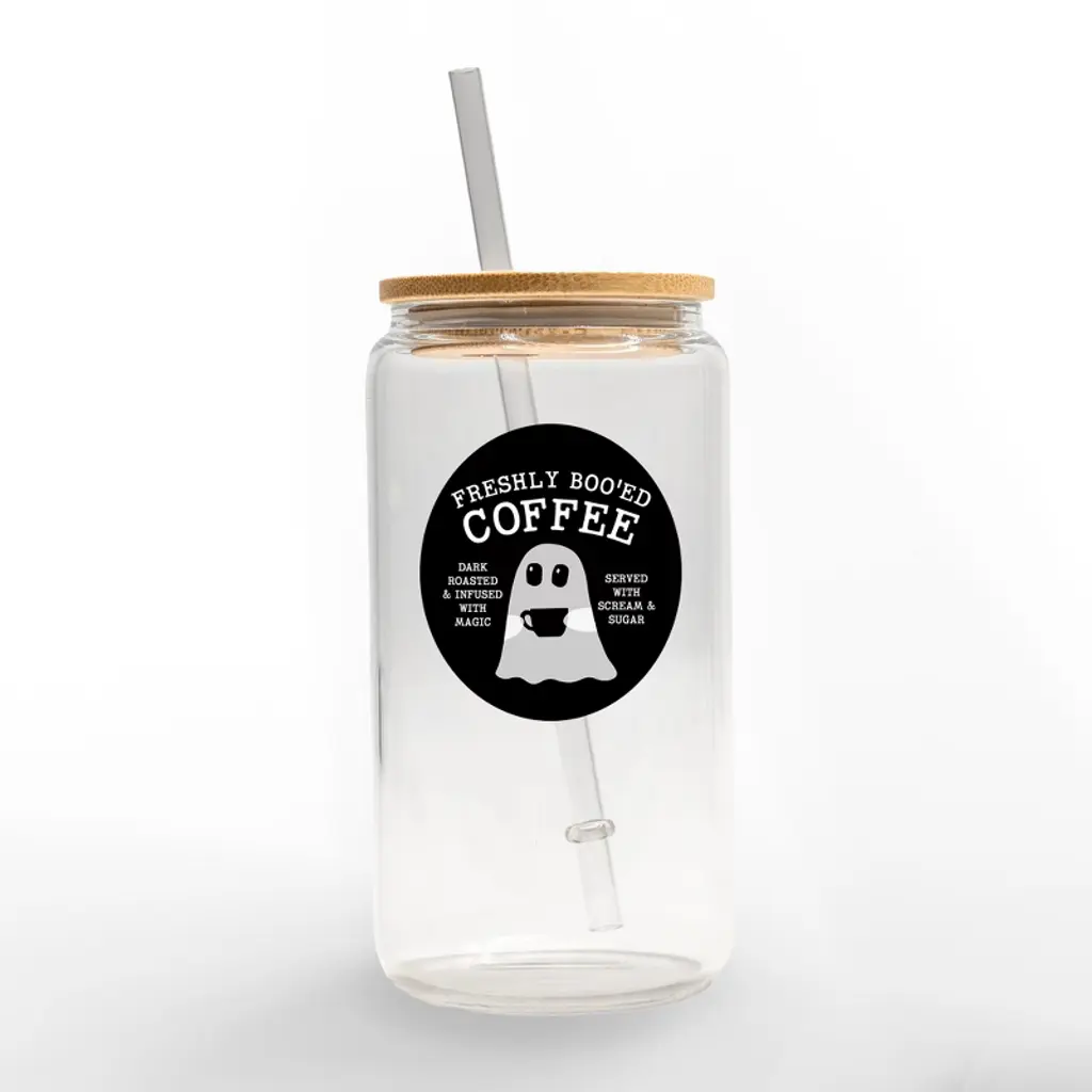 Add a spooky touch to your drinkware this Halloween season with this festive glass can cup. Designed and printed in the United States on quality materials, this is an item you’re sure to love. Enjoy your favorite beverage in this glass can cup with a bamboo top and glass straw designed in the USA. 16-ounce capacity Dimensions: 3x3x5.8 Reuseable glass can cup with a bamboo top and a trendy glass straw Great for daily use of iced beverages Hand wash only