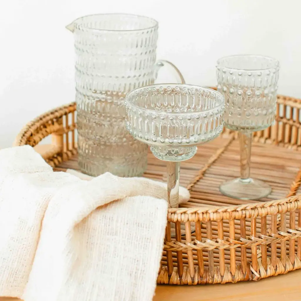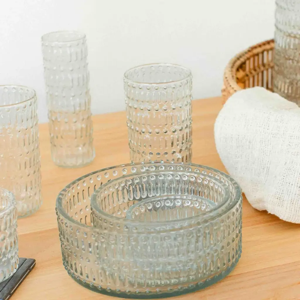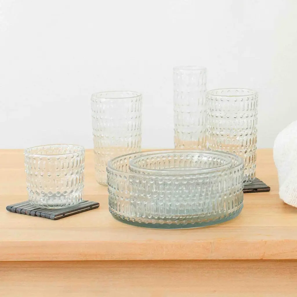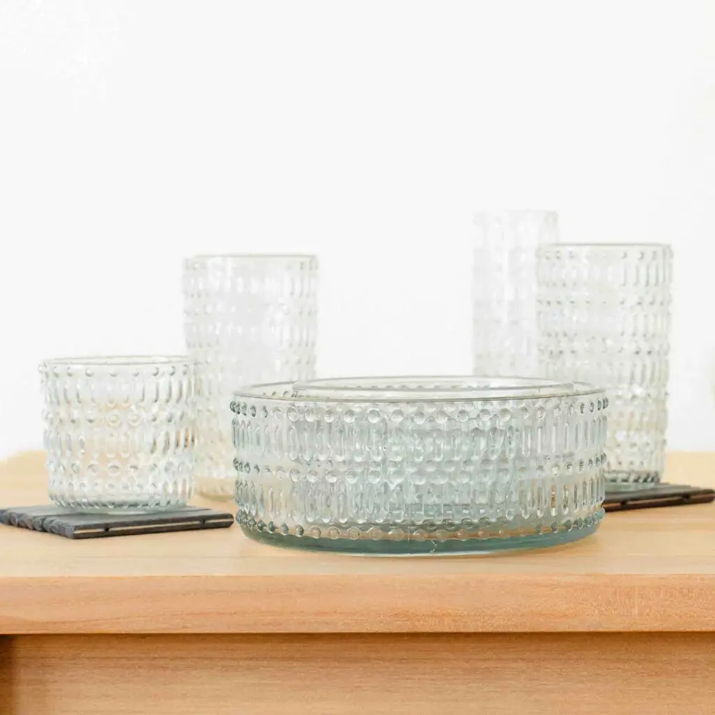 The dot and dash pattern of this glass reminded us of the original digital communication method: Morse Code. Hence the name. With Morse we are sending a message about glassware that looks dressed up for special occassions but still comfortable in everyday use.