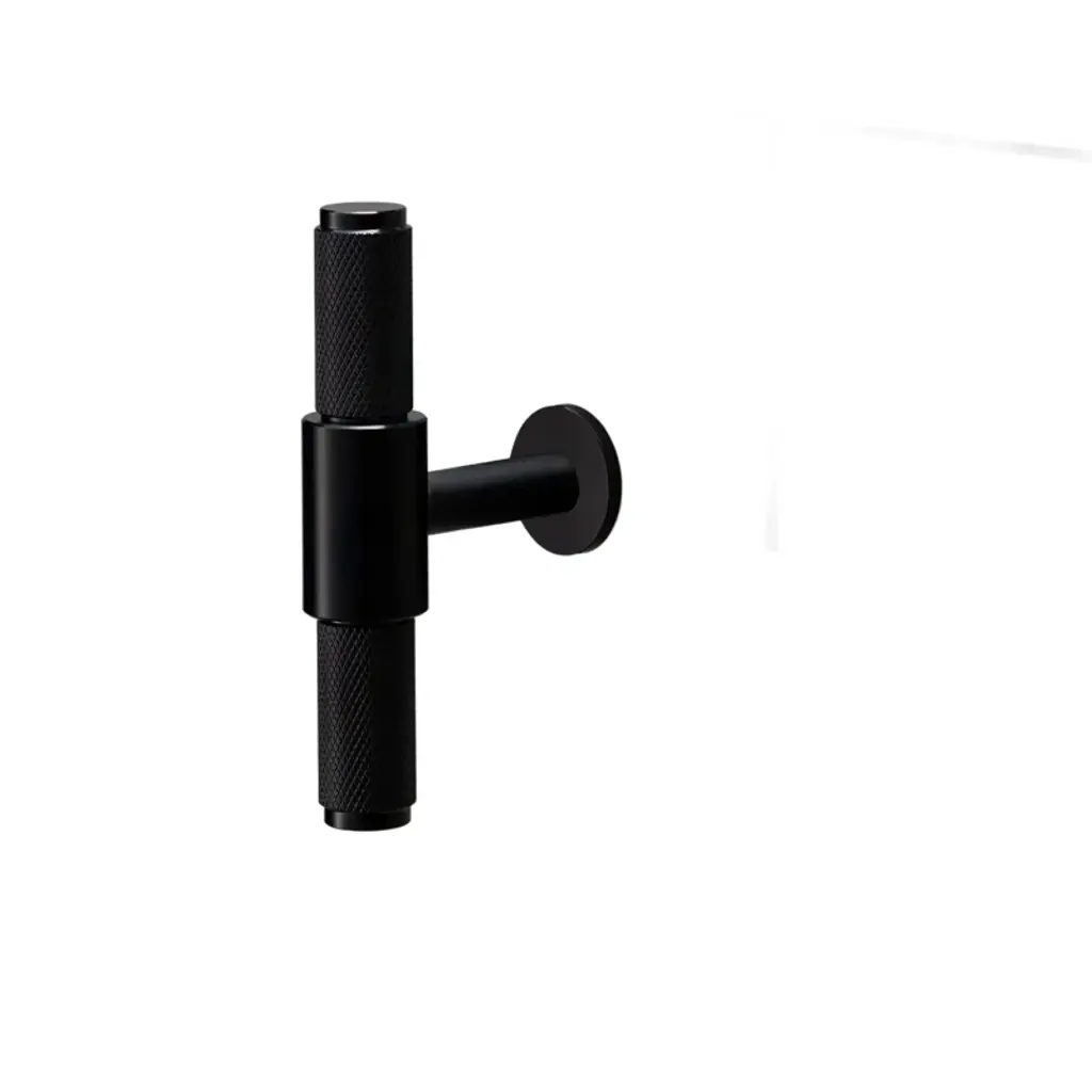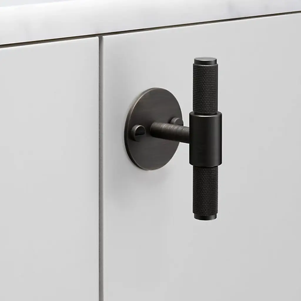 The Cross Plate T-Bar from Buster + Punch offers easy actuation to indoor drawers and cabinet doors with a stark, simple strength. Differentiated from similar B+P fixtures through the coin-style screws that secure its plate and add a touch of texture, it can be attached vertically or horizontally, extending a slim stem from a circular mount. A smooth central cylinder forms the top of the “T-Bar” handle, while the more slender outer segments are accentuated with grooved cross-knurled surface texture, forming a B+P signature diamond texture.