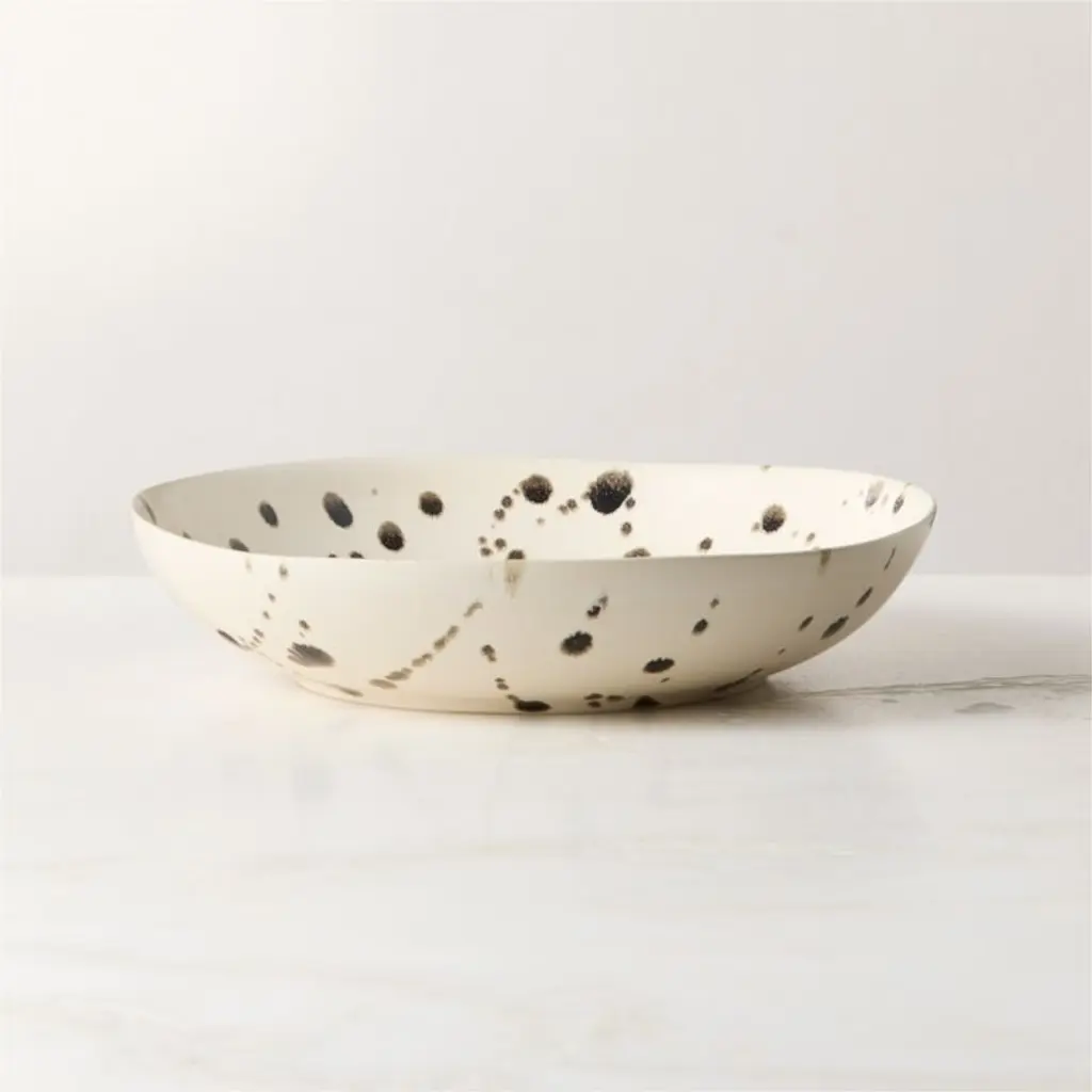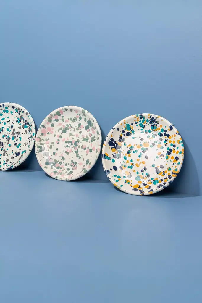 Enamelware coupe salad plates in tricolor patterns, inspired by the vibrant hues found in the sparkling waters and natural landscape of Catalina Island. Crow Canyon Home was founded in 1977 and is renowned as the originator of the iconic splatter enamelware design. A female-owned and family-operated small business, Crow Canyon Home has the largest selection of enamelware products in the world. From tabletop and dinnerware to cookware and bakeware, every item is handmade and expertly crafted by artisans to ensure quality, style, and function.* Porcelain enamel & steel* Set of 4* Hand painted* Dishwasher safe * Food safe* Safe to use on the stovetop, grill, and in the oven* Do not microwave* Imported#### *Dimensions** 0.75 H, 8.25 diameter