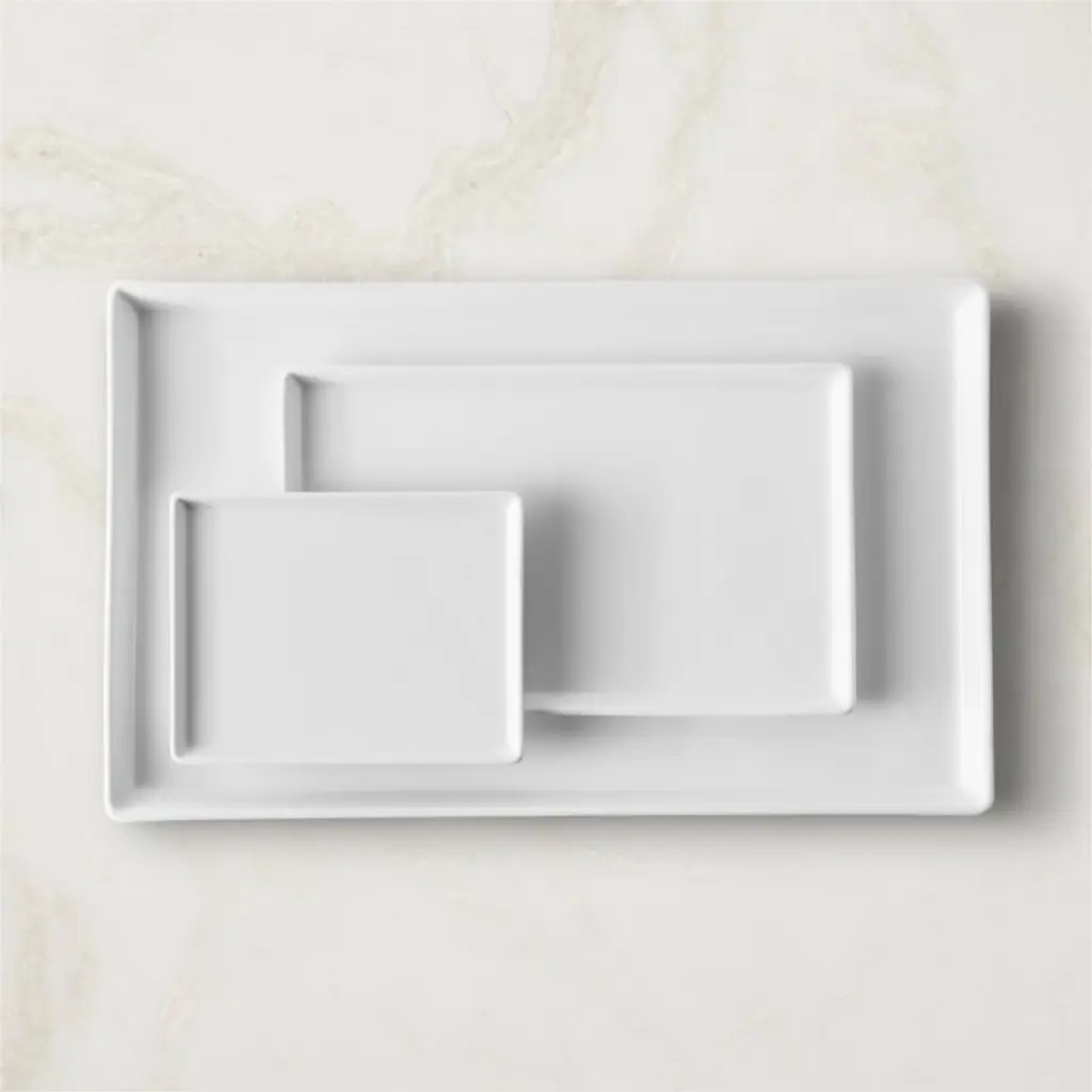 A clean skim of a raised rim platter in gleaming white durable porcelain. Large, medium and small to layer. Medium doubles as an unconventional dining plate shape.