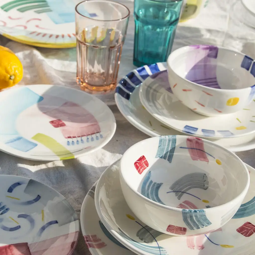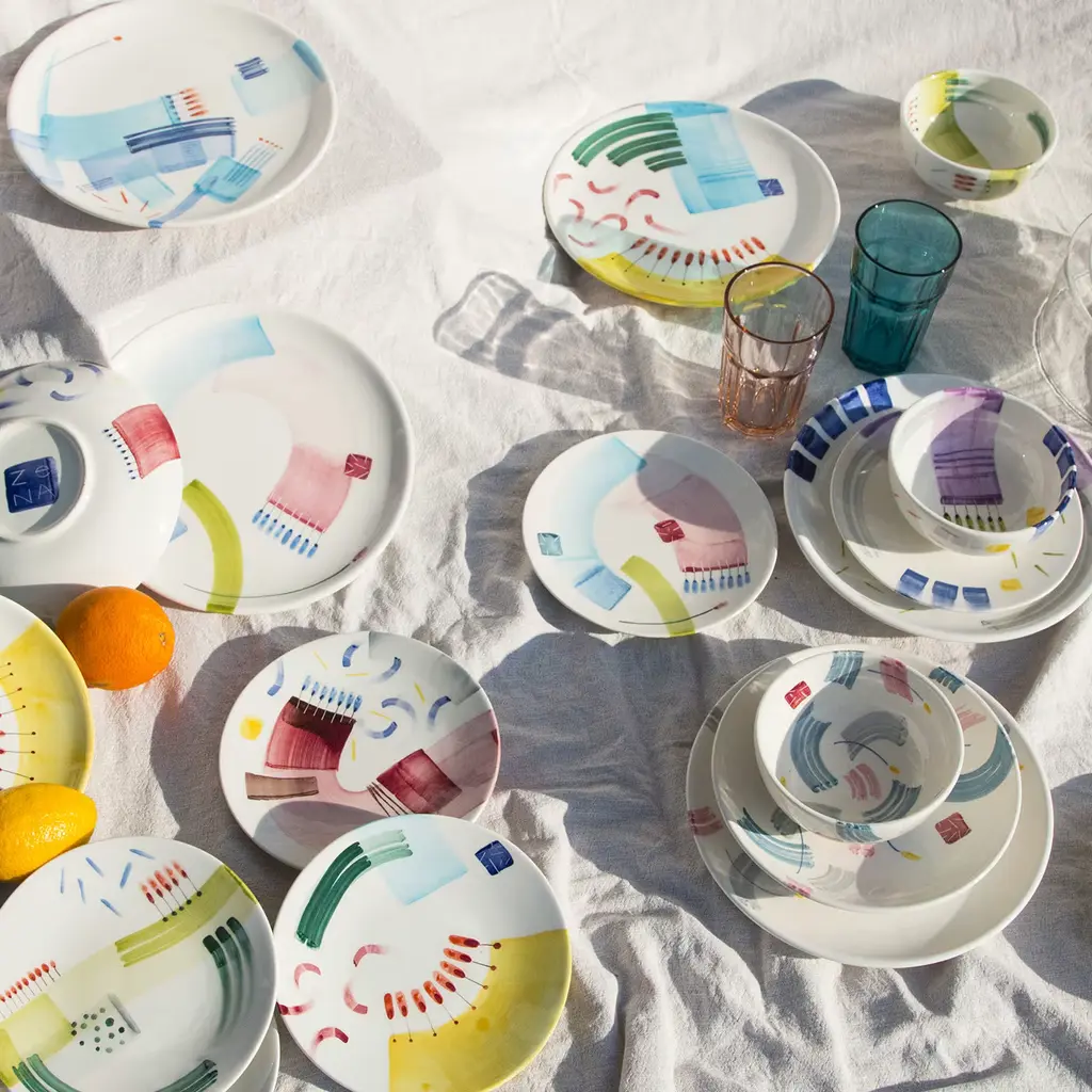 This set of two dinner and soup plates belongs to the Divertissement collection. The plate is enhanced by sober and elegant shapes that seem to chase one another in the round space of the plate. The main inspiration for this design is the Cuboro game. Each piece is unique and entirely handmade painted, the design may slightly vary. Please, contact the Concierge for further information and options.