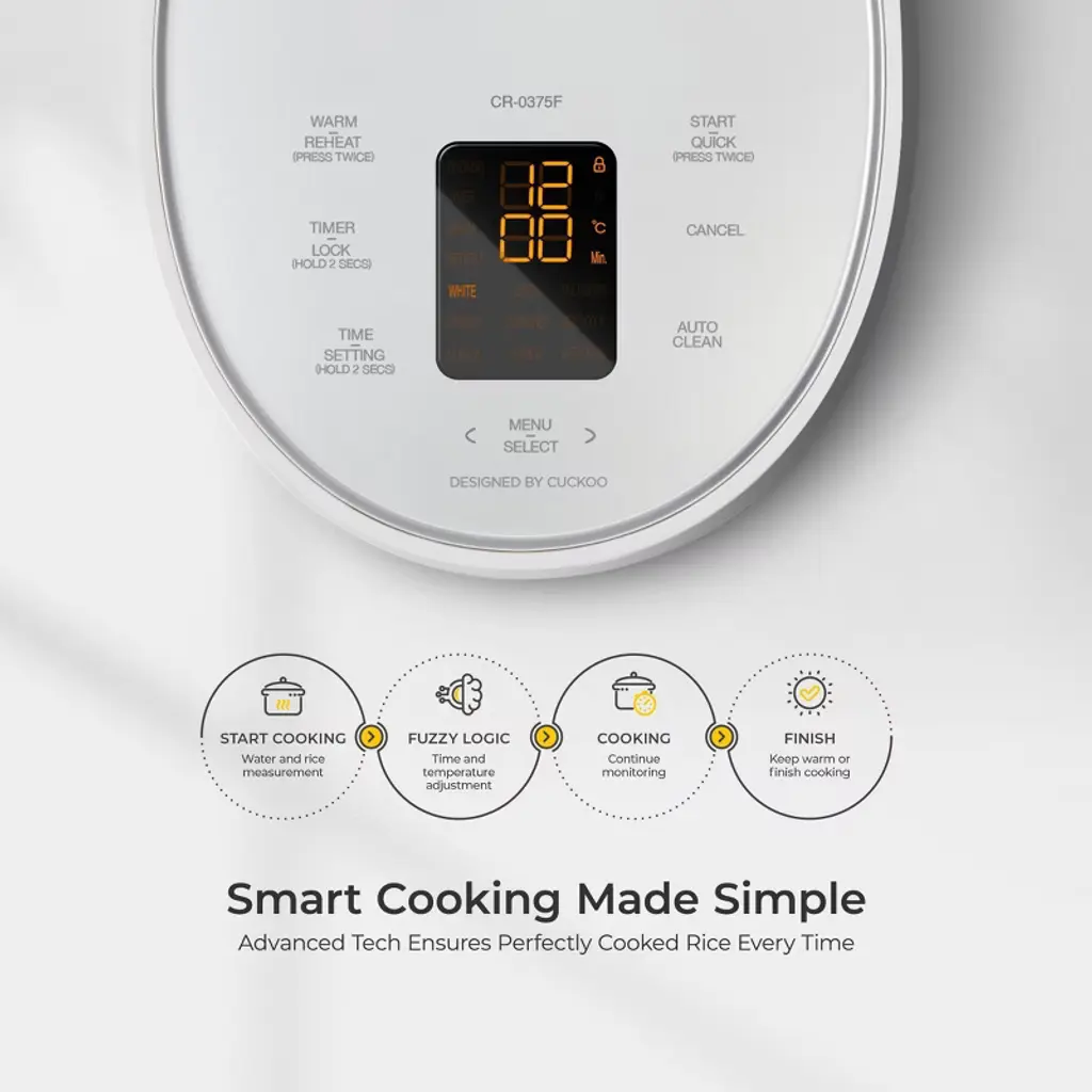 As an industry leader and a trusted Korean brand, CUCKOO strives to consistently deliver premium quality kitchenware and home products to households around the globe. Our 3-Cup (Uncooked) Micom Rice Cooker & Warmer (CR-0375F) boasts preset functions to automatically cook your favorite rice and grains to your own customized liking along with a multi-cook function that can effortlessly prepare soups, stews, porridge and more! Its reheat function is optimal for leftovers, its keep-warm mode will keep your cooked rice at serving temperatures without overcooking it, and its preset timer will allow you to put ingredients in the inner pot hours in advance and have fresh, perfectly cooked rice ready right when you want it. With seemingly endless features and functions like these, the mealtime possibilities are endless.After the cooking is completed, the convenient auto-clean mode will automatically steam clean your unit for easy and effortless cleanup while the detachable inner lid can be occasionally removed and cleaned after use to make sure your grains always taste delicious. Featuring high-quality construction and premium accessories, such as the included nonstick inner pot, the rice measuring cup for precise measuring, and user-friendly digital controls, you'll be cooking with confidence in no time.