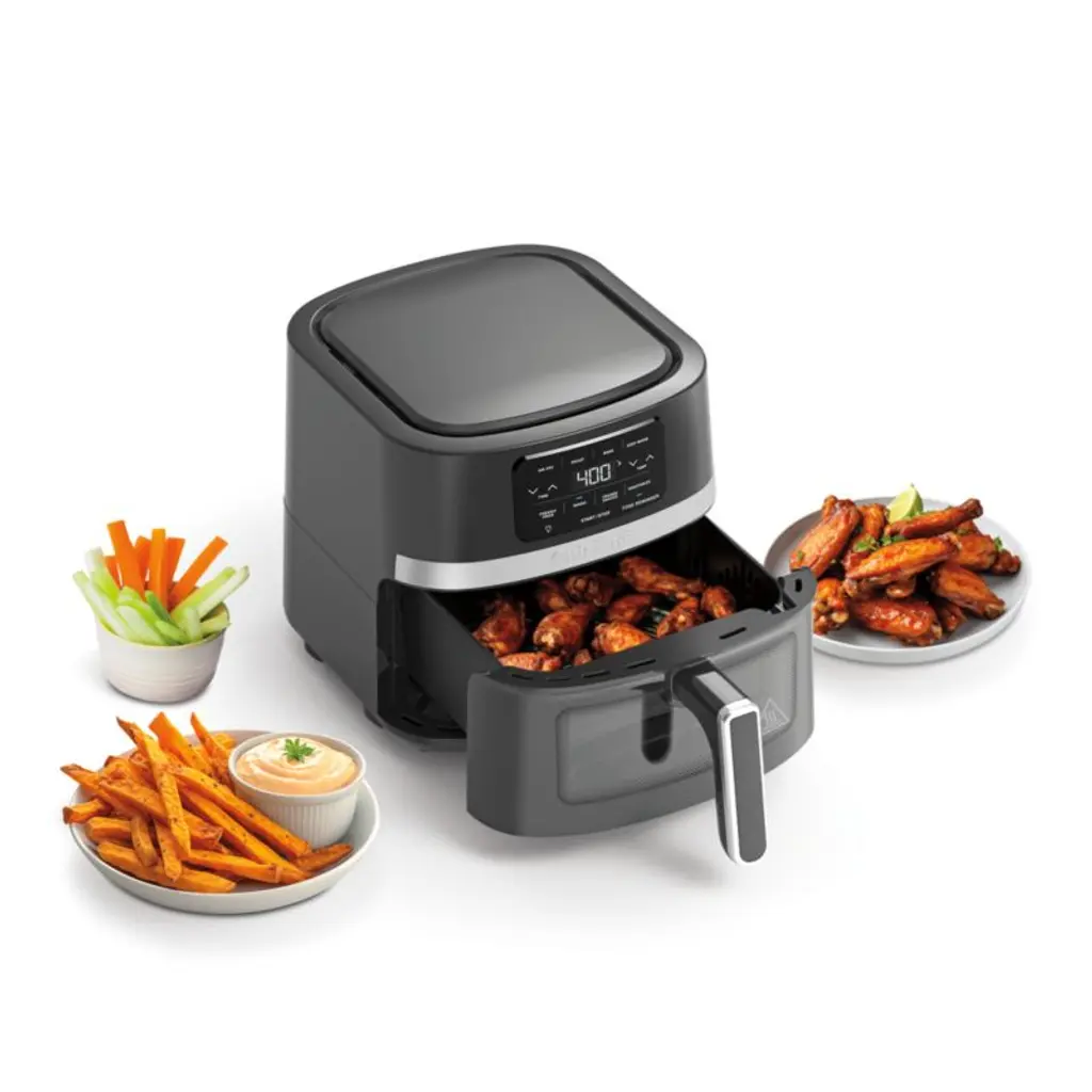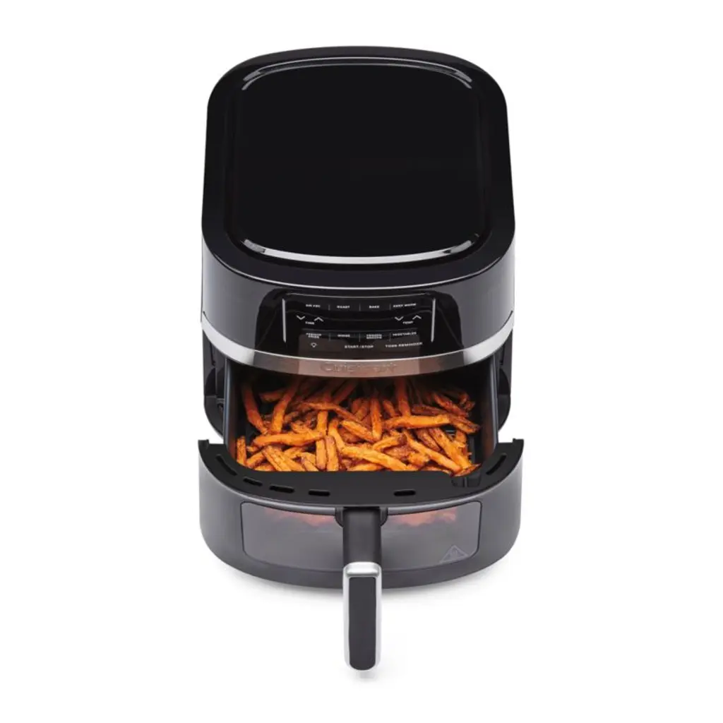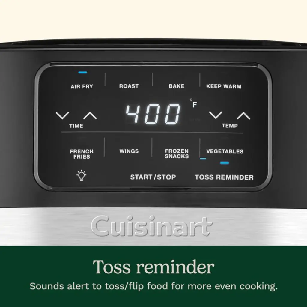 Air fry fresh-cut french fries, frozen spring rolls, brussels sprouts and more in this versatile appliance. With a generously sized non-stick basket, the air fryer cooks quickly and evenly with hot air and little to no oil. Choose from four popular air-fried foods presets, or use to roast or bake. Ingenious features include a toss notification that reminds you to flip food halfway through cooking and a keep-warm function that maintains temperature without drying. The compact black kitchen essential looks modern on your countertop.Cuisinart has been creating inventive and accessible kitchen appliances, cookware and accessories for over 50 years.