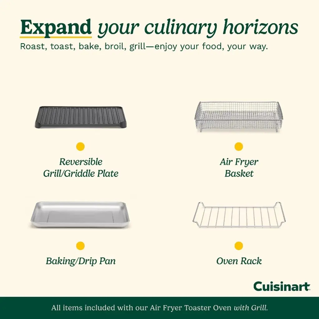 The Cuisinart Air Fryer Toaster Oven with Grill brings next-generation cooking to your countertop with a quiet, powerful, stainless steel construction. Air fry healthier and delicious proteins, from chicken breast, chicken wings to salmon or burgers. Introduce an array of air fried vegetables to your dinner table, including air fried potato wedges, crispy brussel sprouts and roasted broccoli. Use the reversible grill/griddle plate to sear steaks and vegetables on one side and griddle the perfect breakfast on the other.. Cook all of your family’s favorites including air fried french fries, baked cookies, and warmed up leftovers. This air fryer oven is our latest and greatest upgrade with a spacious 8-function oven that makes cooking a feast for family and friends — or a simple snack for one — fun, fast, and easy.