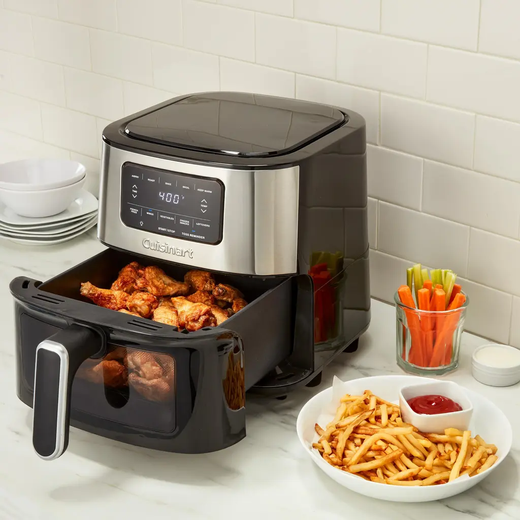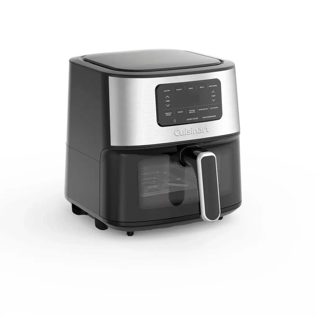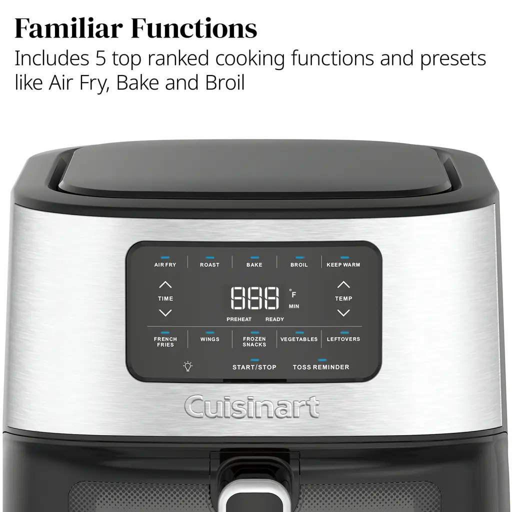 Cook everything from simple snacks to main meals with the versatile Cuisinart® Basket Air Fryer. This countertop cooker lightens up fried foods with fast and even hot-air-powered cooking — using little or no oil — for making healthy meals with the crispy crunch you love. Five popular pre-programmed settings, a toss notification to flip food mid-way through cooking, and convenient viewing window make it easy to air fry, roast, bake, broil, and warm food with delicious results every time. Lighten up your menu with the convenient air fryer that does more for mealtime! 6 quart internal capacity 5 cooking functions with no preheat needed include: Air Fry, Roast, Bake, Broil and Keep Warm Large Viewing window with interior light Digital Display with 5 Air Fry presets: French Fries, Wings, Frozen Snacks, Vegetables, Leftovers Toss reminder to flip food halfway through cooking Automatic warm mode post cooking cycle Adjustable Temperature (up to 450°F) Up to 60-minute timer with auto-pause when basket is removed Nonstick, dishwasher safe easy-clean crisper basket Whisper quiet operation Includes: Air Fry Basket and Crisper Plate 1800 Watts 3 year limited warranty