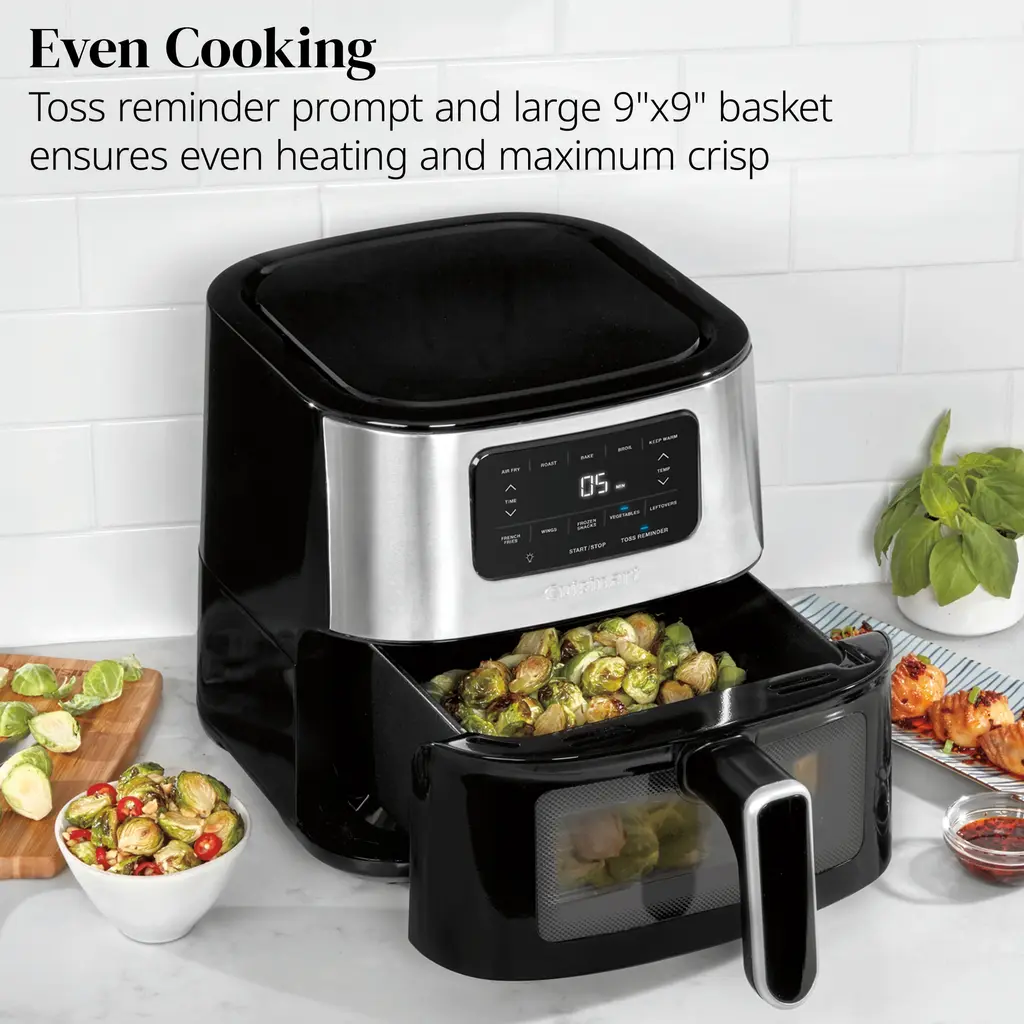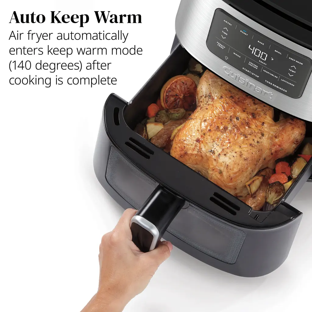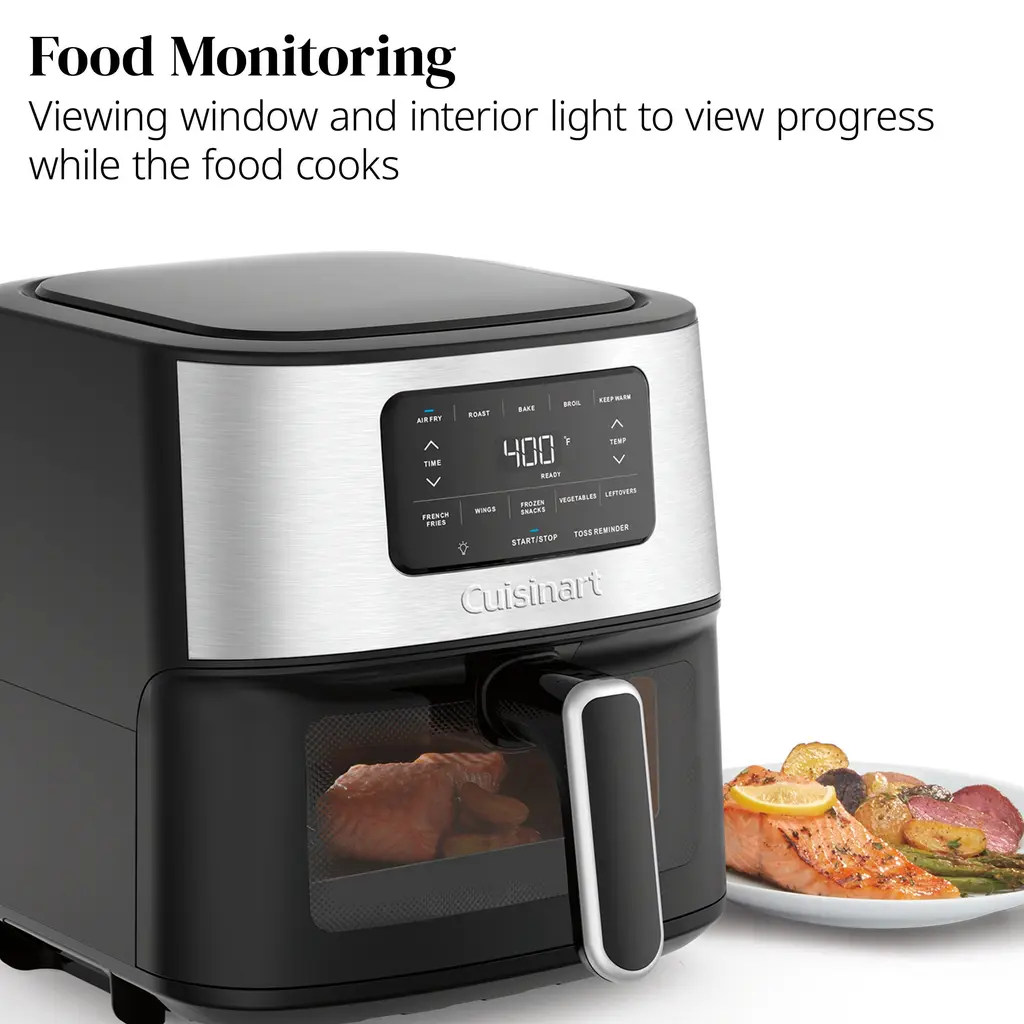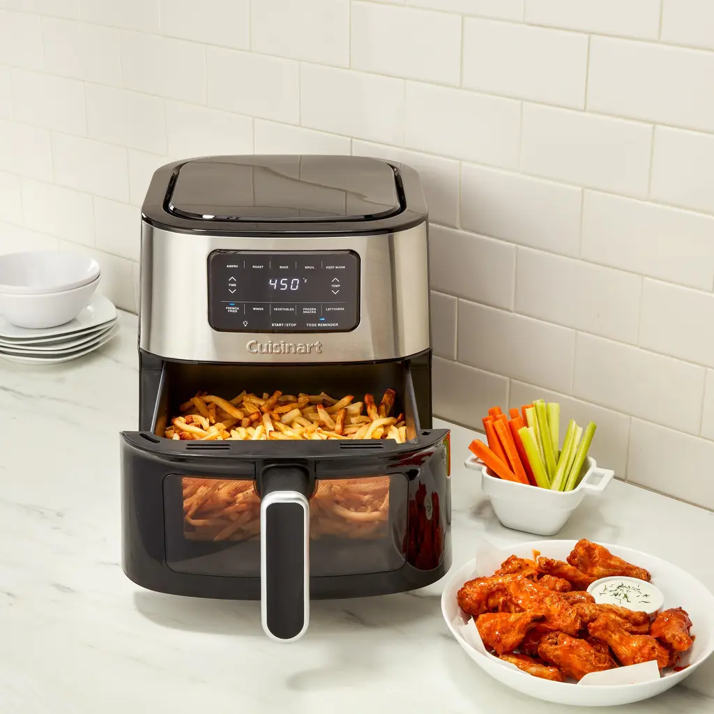 Cook everything from simple snacks to main meals with the versatile Cuisinart® Basket Air Fryer. This countertop cooker lightens up fried foods with fast and even hot-air-powered cooking — using little or no oil — for making healthy meals with the crispy crunch you love. Five popular pre-programmed settings, a toss notification to flip food mid-way through cooking, and convenient viewing window make it easy to air fry, roast, bake, broil, and warm food with delicious results every time. Lighten up your menu with the convenient air fryer that does more for mealtime! 6 quart internal capacity 5 cooking functions with no preheat needed include: Air Fry, Roast, Bake, Broil and Keep Warm Large Viewing window with interior light Digital Display with 5 Air Fry presets: French Fries, Wings, Frozen Snacks, Vegetables, Leftovers Toss reminder to flip food halfway through cooking Automatic warm mode post cooking cycle Adjustable Temperature (up to 450°F) Up to 60-minute timer with auto-pause when basket is removed Nonstick, dishwasher safe easy-clean crisper basket Whisper quiet operation Includes: Air Fry Basket and Crisper Plate 1800 Watts 3 year limited warranty