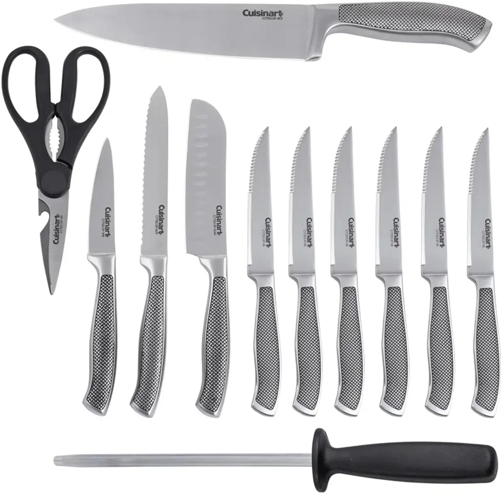 The Cuisinart C77SS-13P Graphix Collection 13-Piece Stainless Steel Cutlery Block Set features superior stainless steel blades for precision cutting. Ergonomically designed handles are textured for comfortable control.