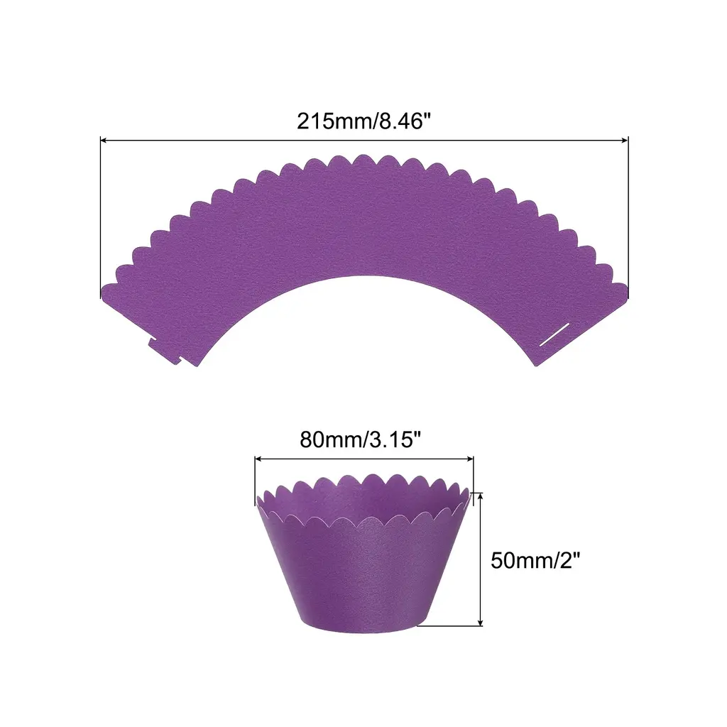 These cupcake wrappers are made of paper material, suitable for great decoration and protection of cupcakes at events, in bakeries, or in cafes.Specification:Color: Dark PurpleMaterial: PaperExpand Size: 215mm x 90mm / 8.46 inch x 3.54 inch(L*W)Assembled Size: 50mm x 80mm / 2 inch x 3.15 inch(D*H)Packing List: 50pcs x Cupcake WrappersAdvantageThese cupcake wrappers are in rich color, great for decorating your cupcakes and keeping your cupcakes tower or looking great for hours. Easy to use, make a finished look of your cupcakes in seconds on your anniversary, birthday, wedding, and party.InstructionThere is a slot for the standard cupcakes. Slide the tab into the slot for assembling the wrapper. Bottomless design, for covering the baking liners on cupcakes or baked goods, drink sleeves, and cupcake collars.NOTE:Not resistant to baking, please do not put it into the oven.