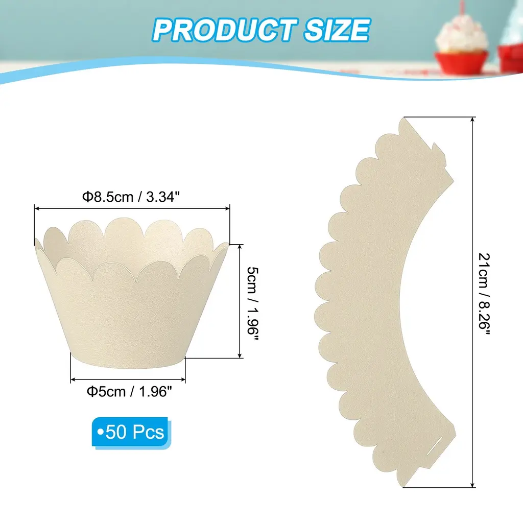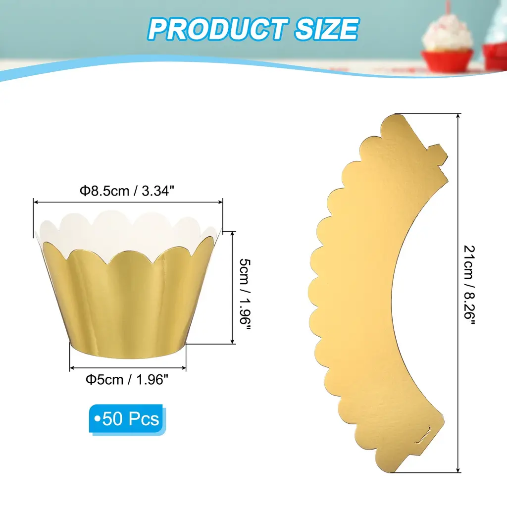 These paper cupcake wrappers are suitable for decorating and protecting cupcakes at events, bakeries, or cafes.Specification:Color: Light GoldMaterial: PaperExpand Size:21 cm x 8.5 cm x 5 cm / 8.26 x 3.34 x 1.96 inch(L*W*H)Packing List: 50pcs x Cupcake WrappersAdvantageThese cupcake wrappers are in rich color, great for decorating your cupcakes and keeping your cupcakes tower or looking great for hours. Easy to use, make a finished look of your cupcakes in seconds on your anniversary, birthday, wedding, and party.InstructionThere is a slot for the standard cupcakes. Slide the tab into the slot for assembling the wrapper. Bottomless design, for covering the baking liners on cupcakes or baked goods, drink sleeves, and cupcake collars.NOTE:Not resistant to baking, please do not put it into the oven.