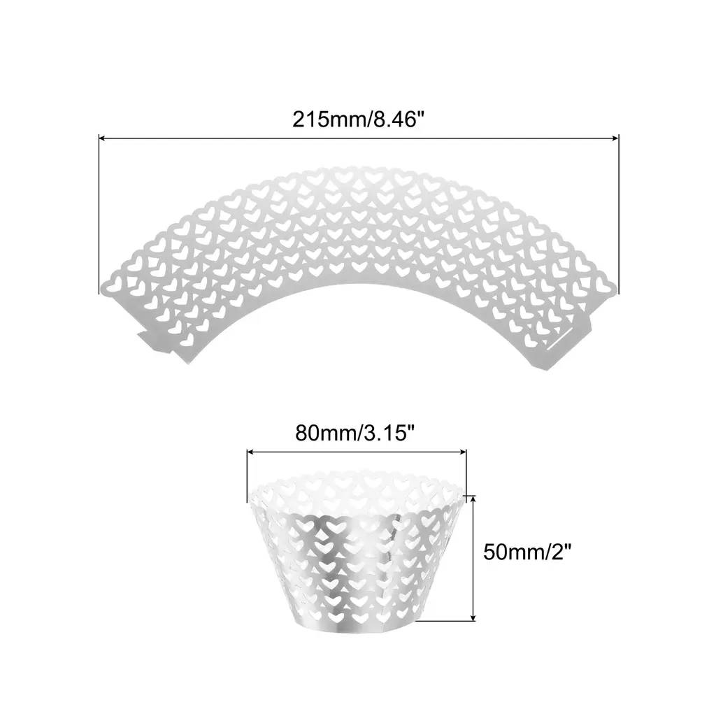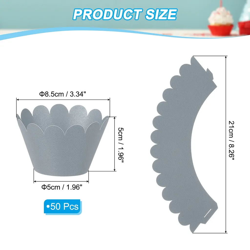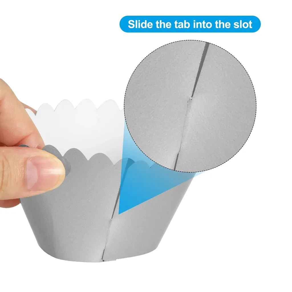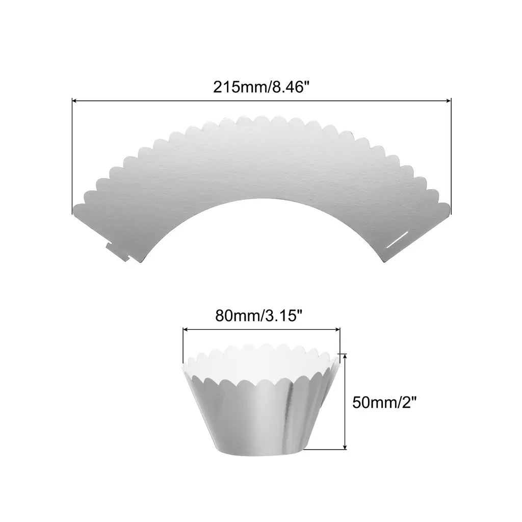 These cupcake wrappers are made of paper material, suitable for great decoration and protection of cupcakes at events, in bakeries, or in cafes.Specification:Color: Silver ToneMaterial: PaperExpand Size: 215mm x 90mm / 8.46 inch x 3.54 inch(L*W)Assembled Size: 50mm x 80mm / 2 inch x 3.15 inch(D*H)Packing List: 50pcs x Cupcake WrappersAdvantageThese cupcake wrappers are in rich color, great for decorating your cupcakes and keeping your cupcakes tower or looking great for hours. Easy to use, make a finished look of your cupcakes in seconds on your anniversary, birthday, wedding, and party.InstructionThere is a slot for the standard cupcakes. Slide the tab into the slot for assembling the wrapper. Bottomless design, for covering the baking liners on cupcakes or baked goods, drink sleeves, and cupcake collars.NOTE:Not resistant to baking, please do not put it into the oven.
