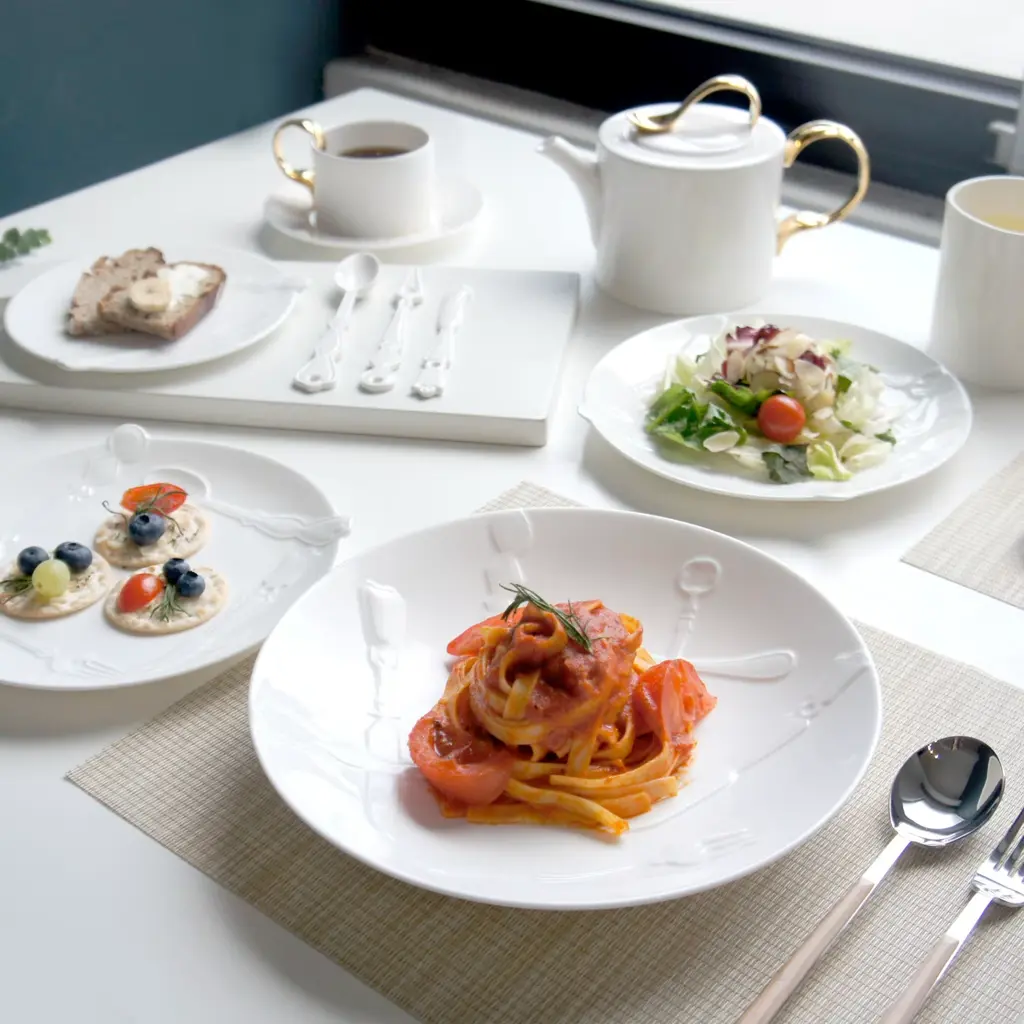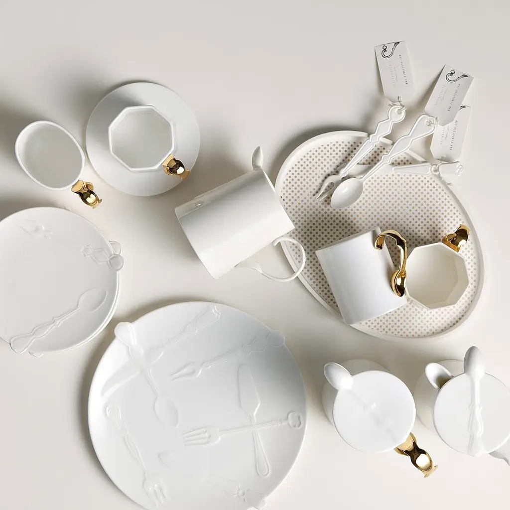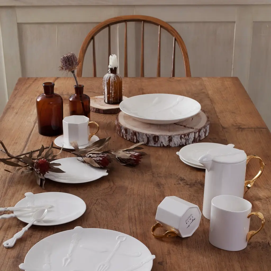 The Cutlery collection is Twig New York’s collaboration with the ceramic artist Hayoon Kim. The collection was inspired by the shapes of antique European cutlery and the absolute purity of white color of Fine Bone. In this collection, the shapes of these antique cutlery pieces are embossed directly onto bare plates to create a unique and contemporary design. The embossed designs add a pleasing texture to the plates. The cups, mugs, and jugs in this collection take the idea one step further with the use of bent spoon and fork shapes for their handles. For an added accent, the handles are finished in hand painted 24k gold.Ideal for Cereal, Salads and ServingOne bowl per boxFine Bone China with Embossed DesignBowl: 10 in. diameterDishwasher & Microwave safeCutlery Collection