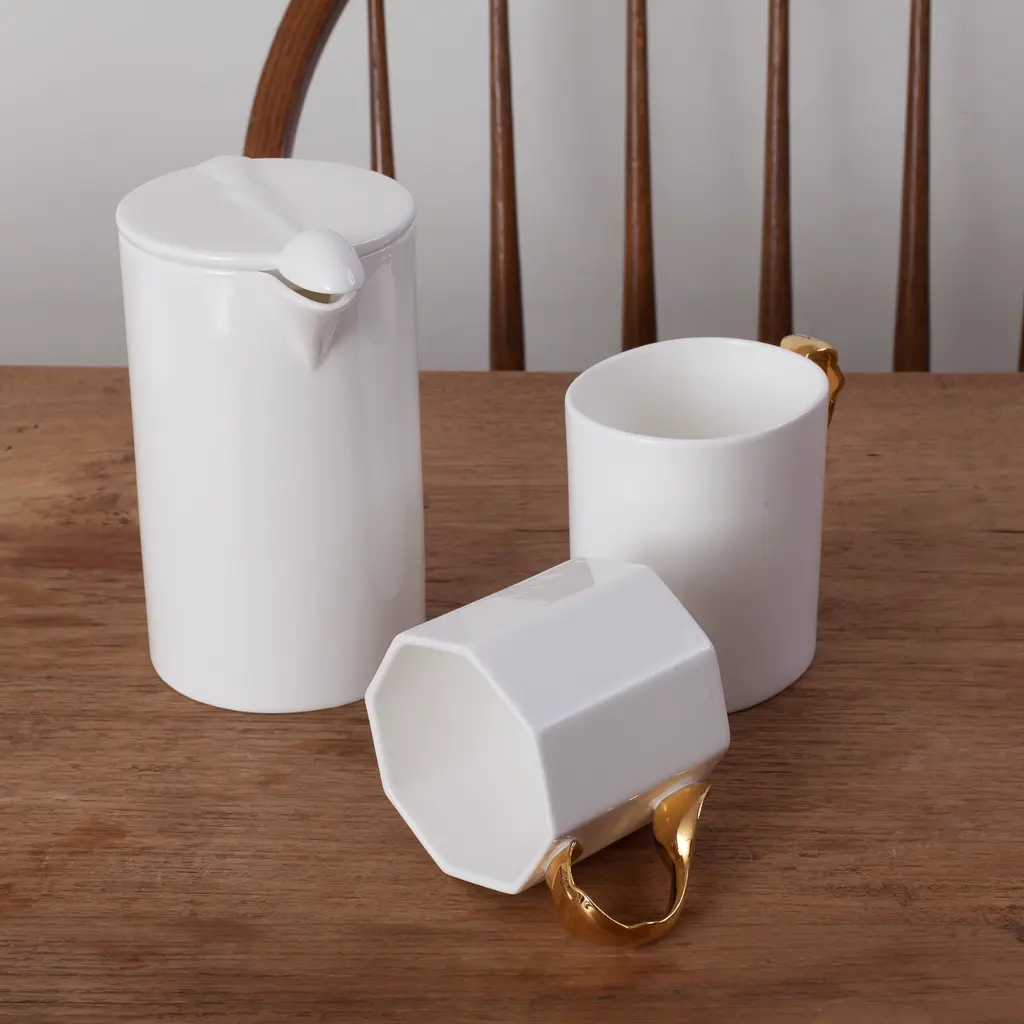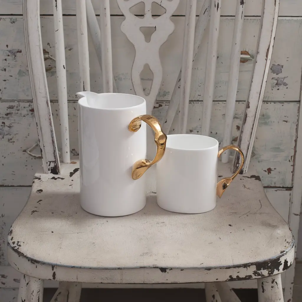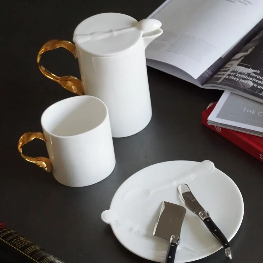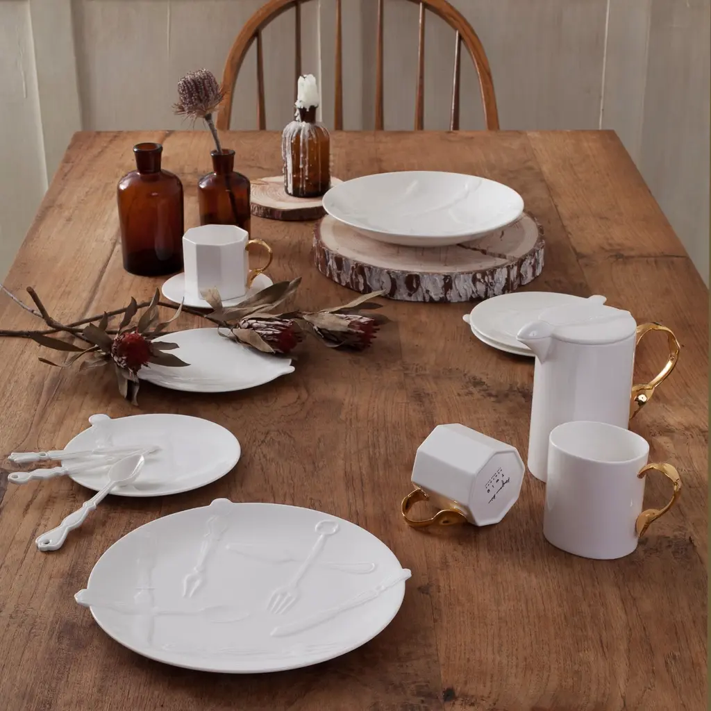 The Cutlery collection is Twig New York’s collaboration with the ceramic artist Hayoon Kim. The collection was inspired by the shapes of antique European cutlery and the absolute purity of white colour of Fine Bone. In this collection, the shapes of these antique cutlery pieces are embossed directly onto bare plates to create a unique and contemporary design. The embossed designs add a pleasing texture to the plates. The cups, mugs, and jugs in this collection take the idea one step further with the use of bent spoon and fork shapes for their handles. For an added accent, the handles are finished in hand-painted 24k gold.Ideal for serving Tea or CoffeeOne Jug per boxFine Bone China with 24K Gold hand painted handleHand wash recommendedCutlery Collection