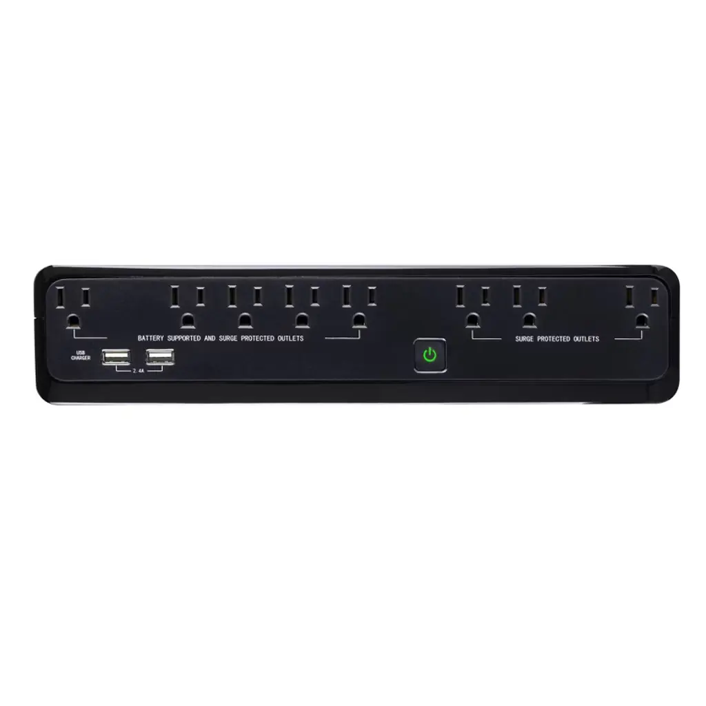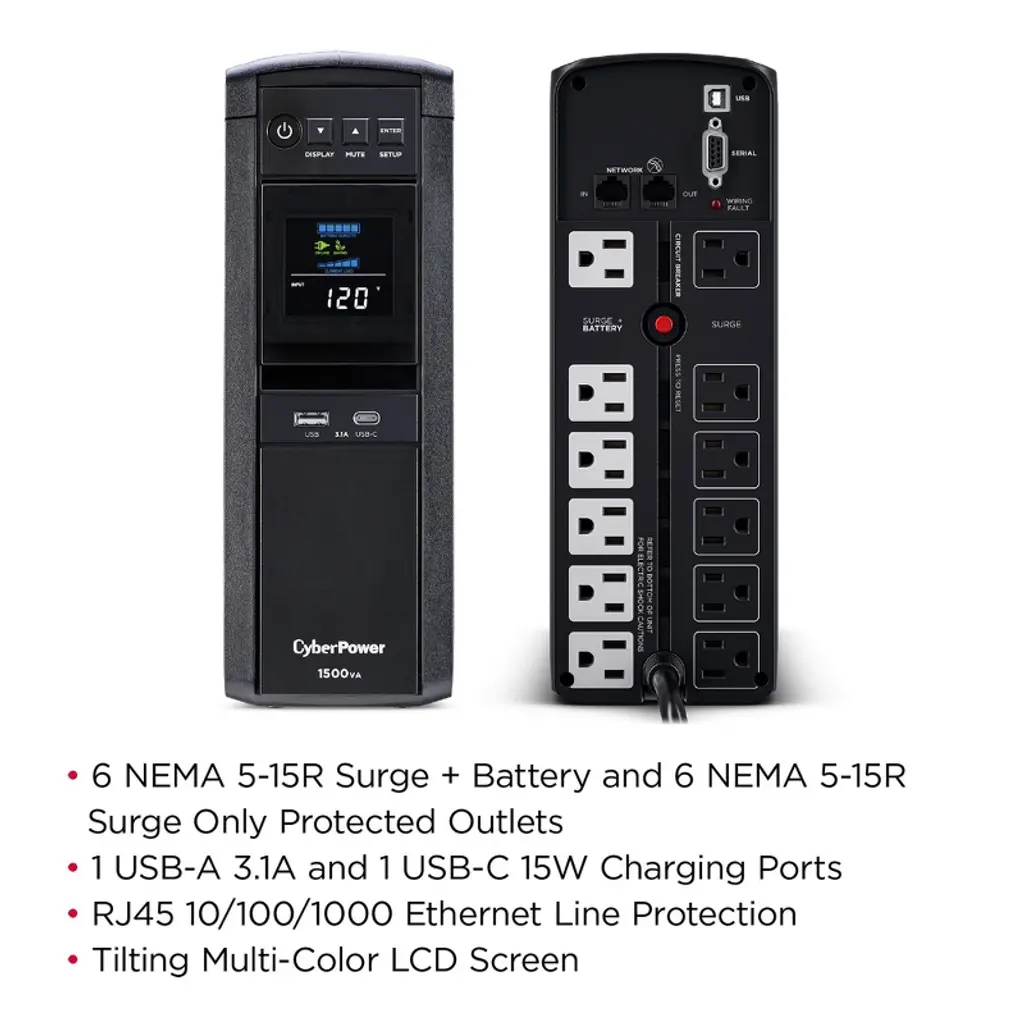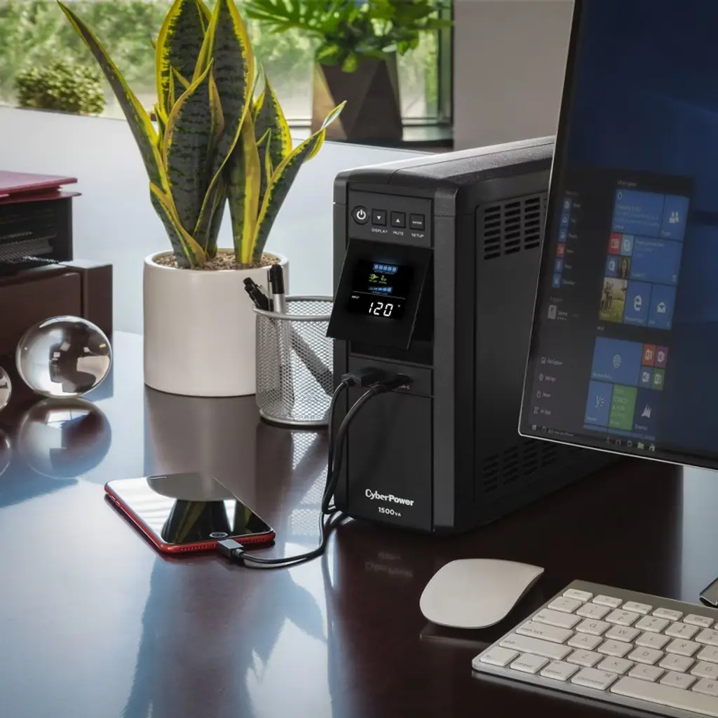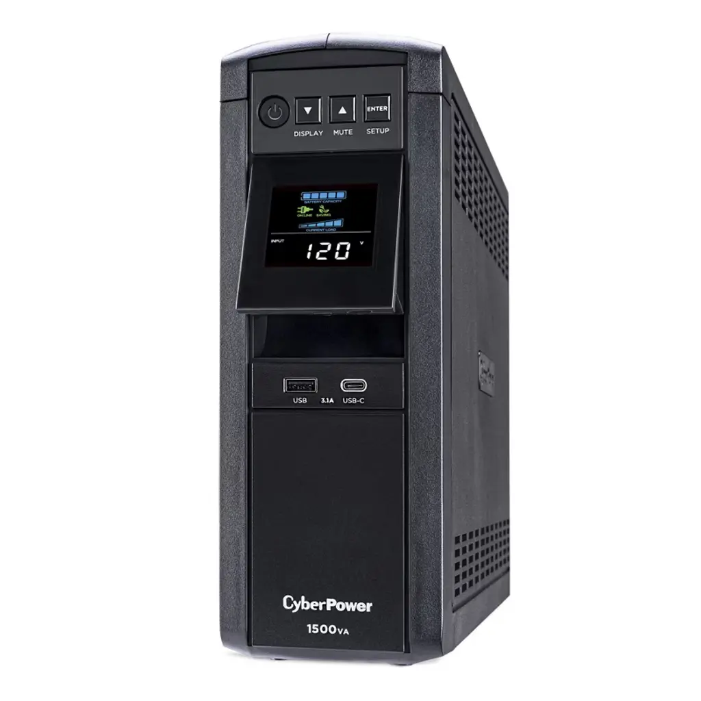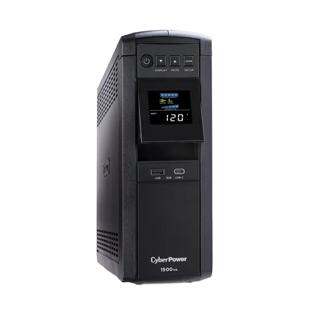 A mini-tower UPS with line interactive topology, the CyberPower GX1500U provides battery backup (using sine wave output) and surge protection for high end desktop computers, TVs, home theater equipment, gaming systems, and networking devices requiring active PFC power source compatibility. The GX1500U features an advanced multifunction control panel with a color LCD to quickly confirm status and alerts at-a-glance. The screen tilts for easy viewing when the UPS is placed in a low position such as under a desk. Two USB charge ports (one Type-A and one Type-C) power portable devices such as mobile phones and tablets, even during a utility power failure. The GX1500U uses Automatic Voltage Regulation (AVR) to correct minor power fluctuations without switching to battery power, which extends battery life. AVR is essential in areas where power fluctuations occur frequently. The GX1500U comes with a three-year warranty (including coverage of batteries) and a $500,000 Connected Equipment Guarantee.