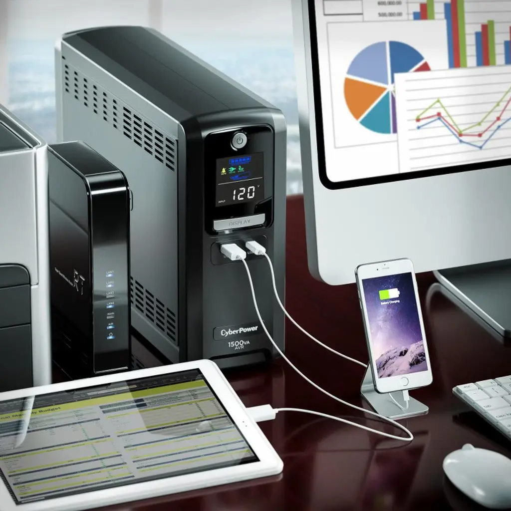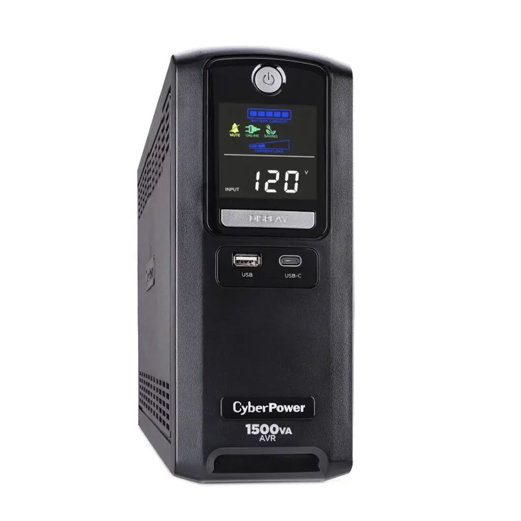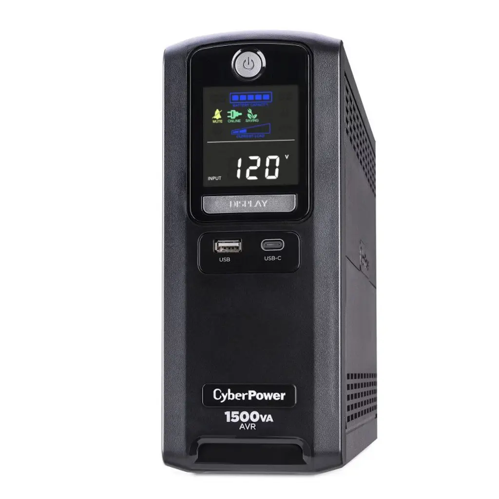 A mini-tower UPS with line interactive topology, the CyberPower LX1500GU3 provides battery backup (using simulated sine wave output) and surge protection for desktop computers, workstations, networking equipment, smart home devices and home entertainment systems. The LX1500GU3 uses Automatic Voltage Regulation (AVR) to correct minor power fluctuations without switching to battery power, which extends battery life. AVR is essential in areas where power fluctuations occur frequently. The LX1500GU3 features an advanced multifunction control panel with a color LCD to quickly confirm status and alerts at-a-glance. Two USB charge ports (one Type-A and one Type-C) power portable devices such as mobile phones and tablets, even during a utility power failure. The LX1500GU3 comes with a three-year warranty (including coverage of batteries) and a $500,000 Connected Equipment Guarantee.