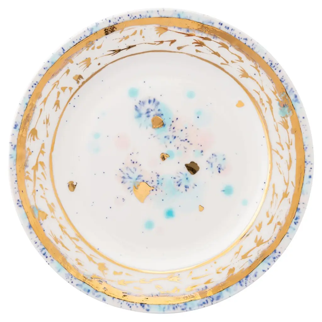 This superb serving plate is part of the Dafne collection, inspired by the opulent elegance of Renaissance and Baroque art and named after one of the six rooms of Galleria Borghese in Rome. This modern interpretation of a classic design combines a stylized garland of roses hand-painted with gold leaf over the white porcelain background. A delicate combination of pale blue and pink adorns the rim of the plate and dots its center for a sophisticated final effect.