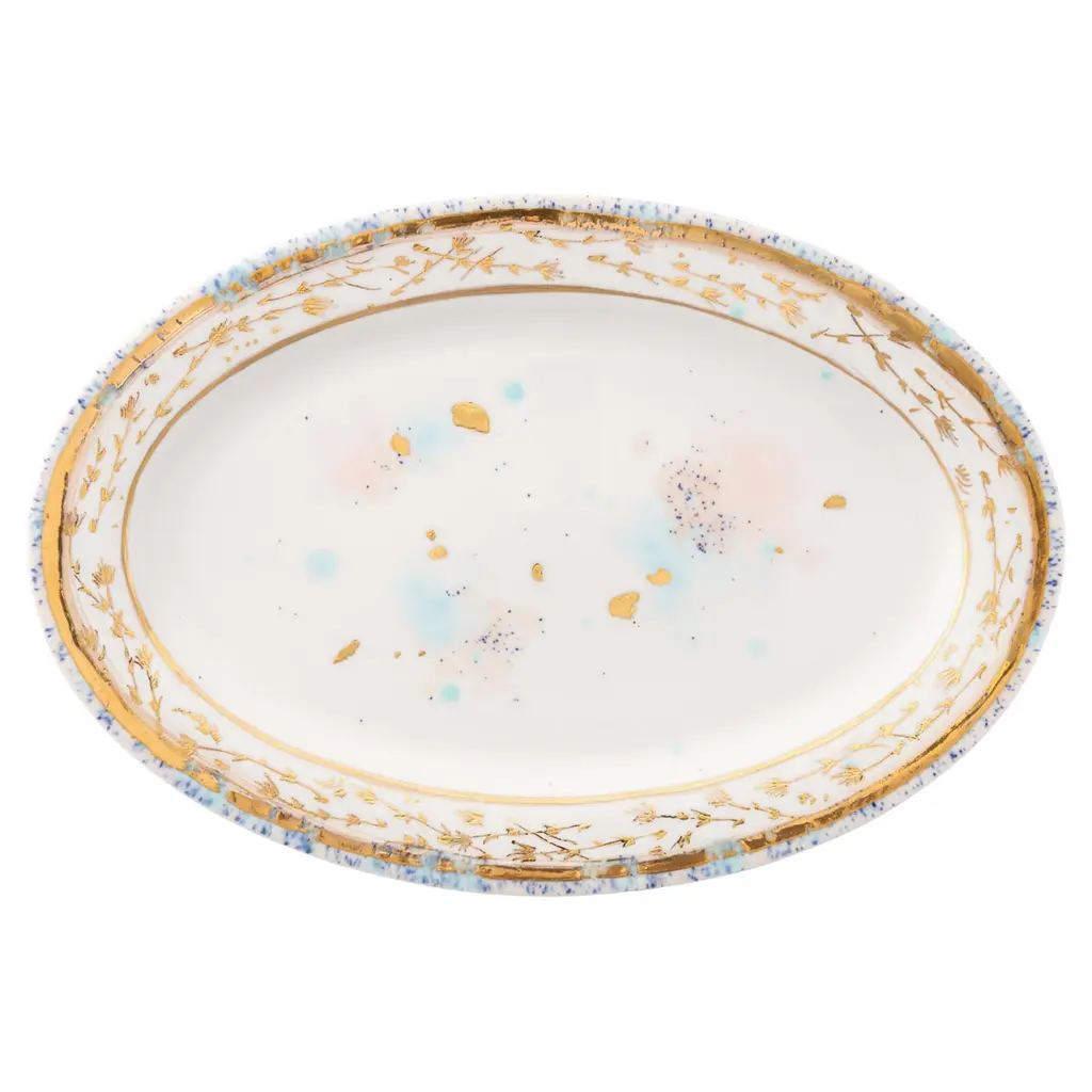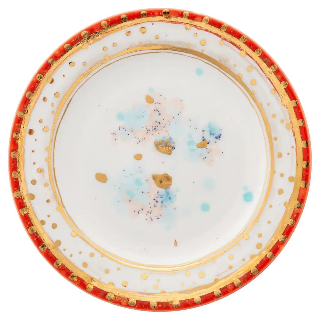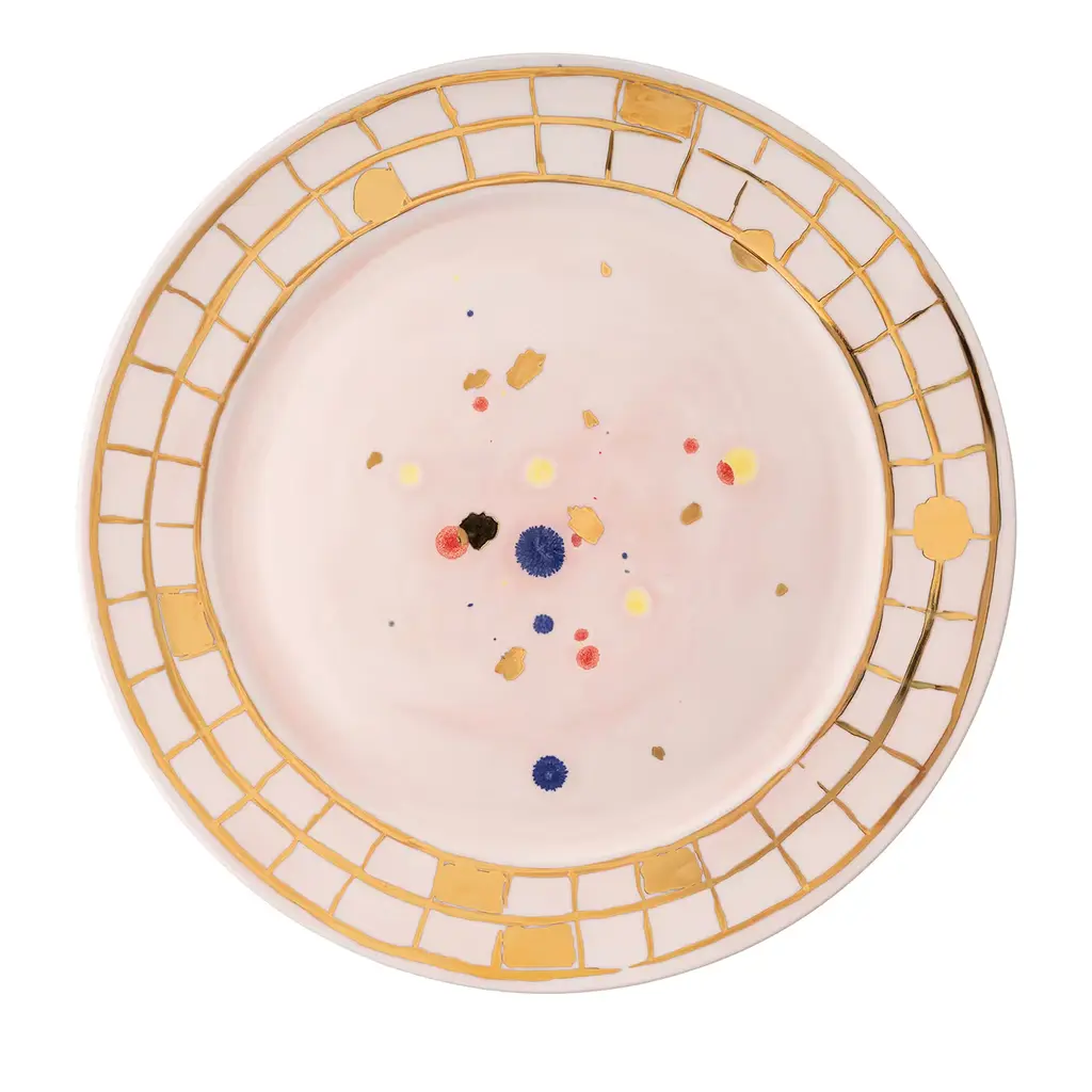 This exquisite set of two soup plates is part of the Dafne Collection, inspired by the glowing golden accents typical of Renaissance and Baroque art. Named after one of the six rooms in Galleria Borghese in Rome, this set is a modern take on a classic design, with a stylized flower garland hand-painted with gold leaf blended with a motif of pink and blue speckles that also graces the center in a more scattered design. Every item is unique and features one-off details applied by Corolla Maiuri.