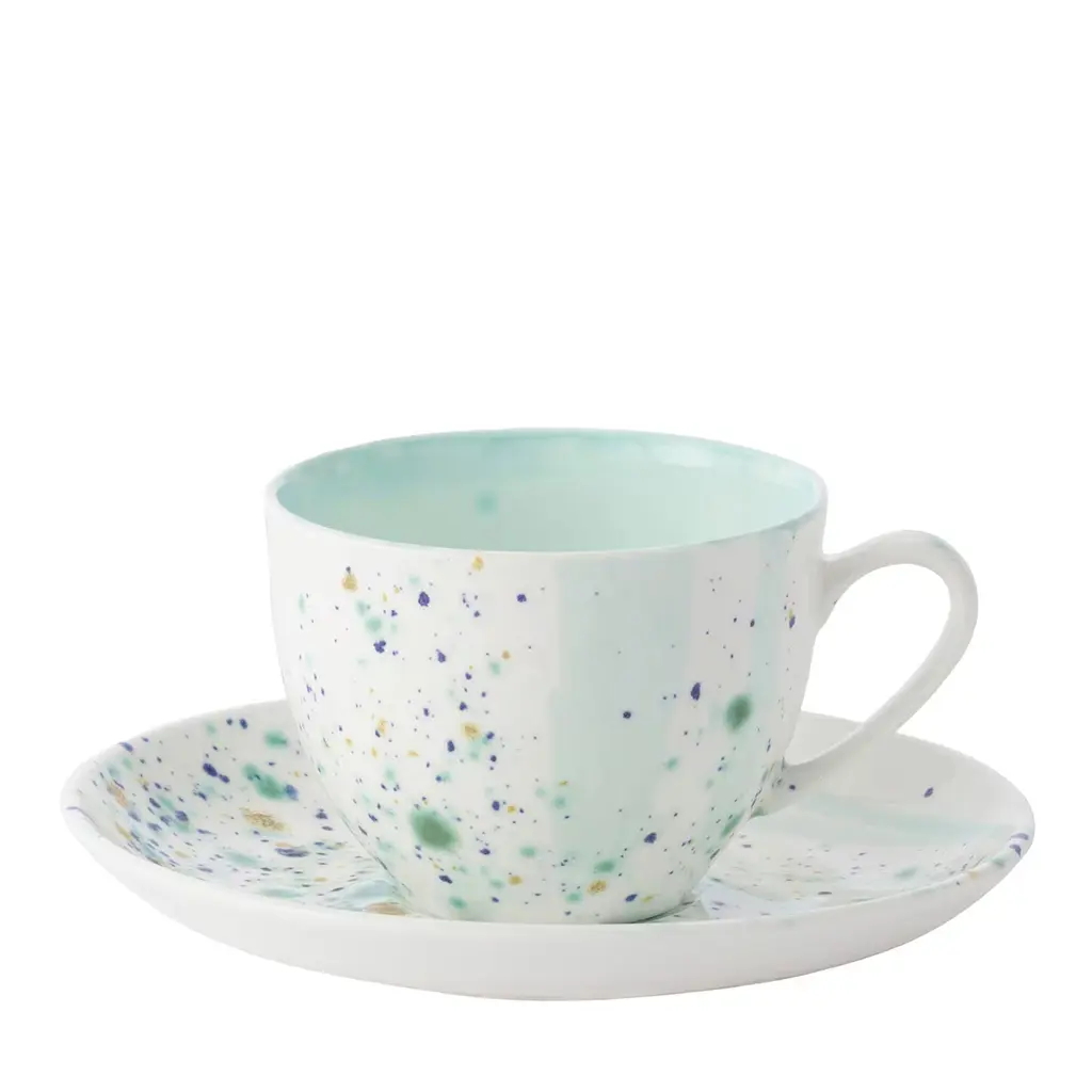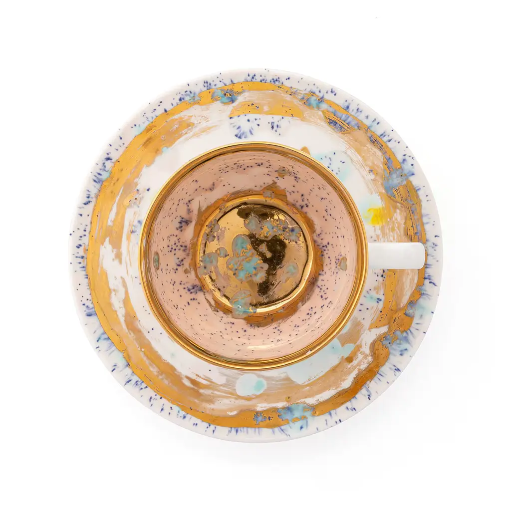 This exclusive set of two porcelain tea cups with coordinated saucers belongs to the Dafne Collection, named after one of the six halls at the Galleria Borghese in Rome. Baroque and Renaissance Art are homaged in the gold leaf on the cups' thin rims, applied with dynamic brushstrokes onto the saucers. A mottled pattern in golden, pink, and blue hues adorns both the exterior and the interior, the latter set against a pale-blue backdrop. Any differences from the pictured item are to be cherished.