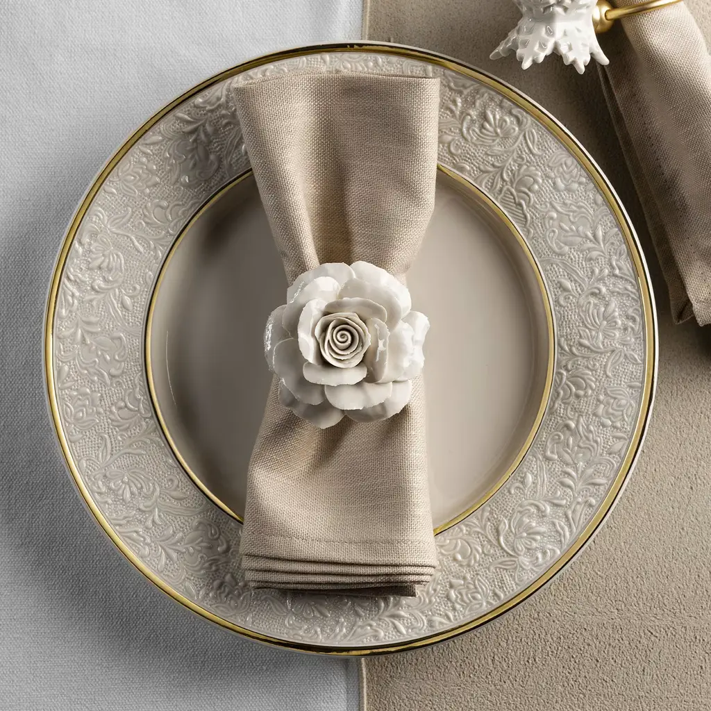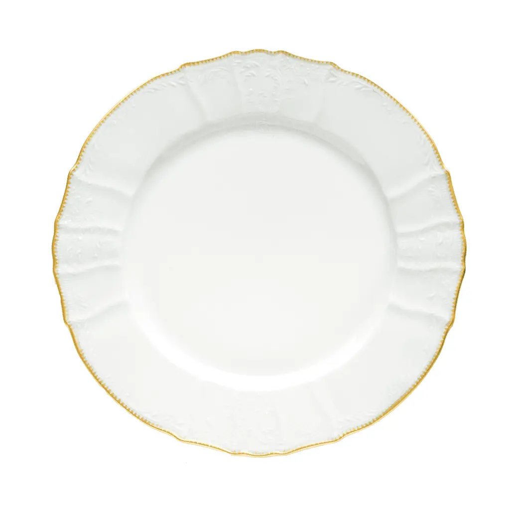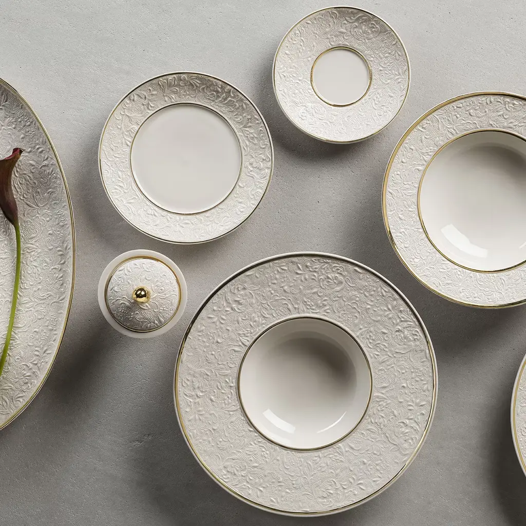 Ancient Eastern tales evocative of regal atmospheres inspired the graceful aesthetic of this fine porcelain set of two dinner plates. Precious golden profiles outline the minute damask texture that extends throughout the borders, a combination of exceptional tactile and visual charm. Soup and serving plate counterparts are available in the Artemest catalog.