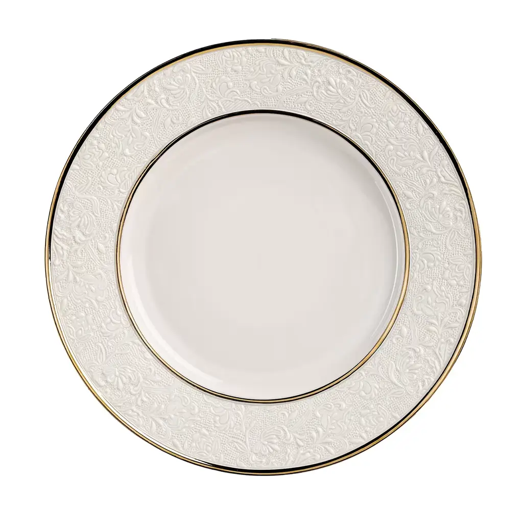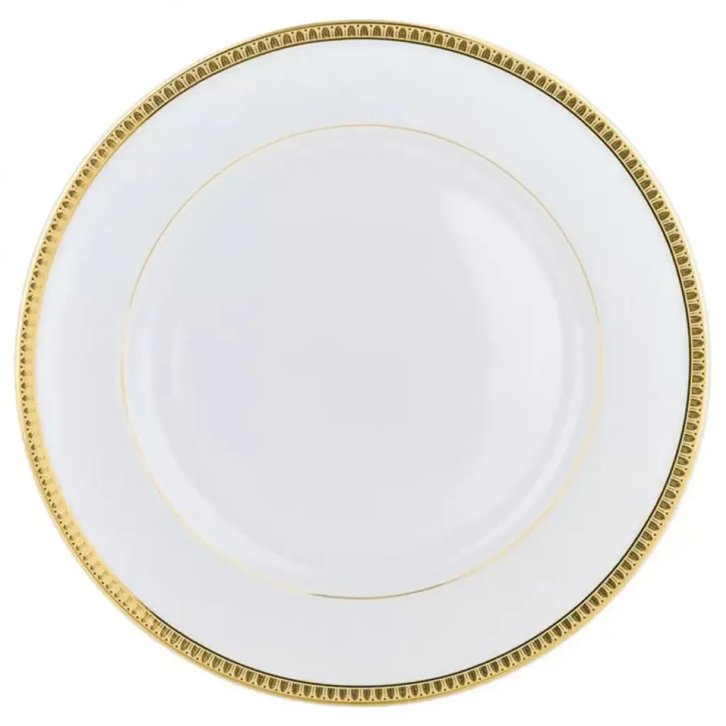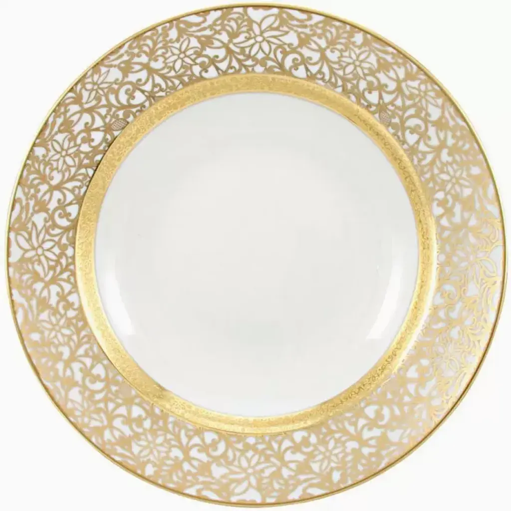 Opulence and grace merge in this sublime set of two fine porcelain soup plates. Part of the elegant Damasco Collection, each plate is aptly distinguished by an exquisite damask texture extending throughout the borders and outlined by gleaming golden profiles. Serving and dinner plate counterparts are available in the Artemest catalog for coherent arrangements of rare refinement.