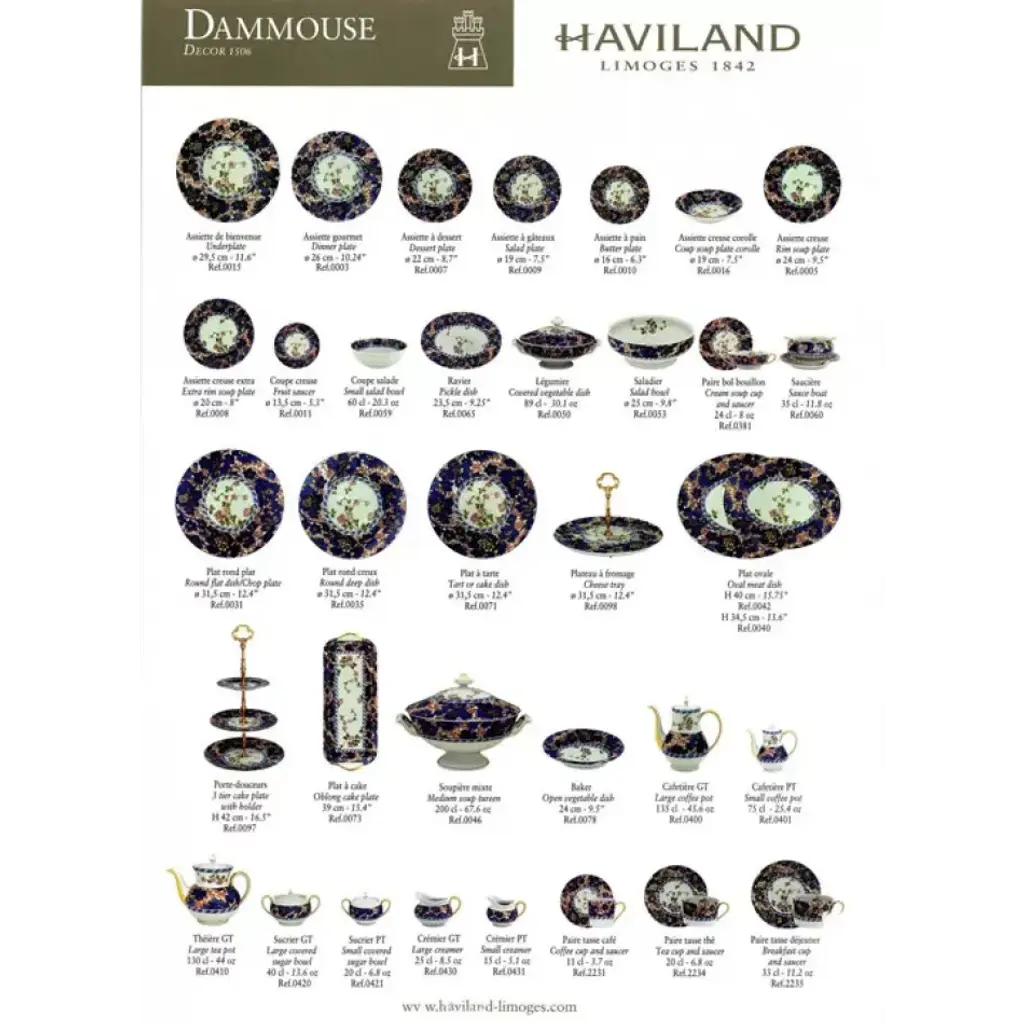Brilliant blooms and gold are hand-painted on white Limoges porcelain for an unforgettable dinnerware collection from Haviland. Five piece place setting includes dinner plate, salad/dessert plate, bread & butter plate, teacup and saucer. Haviland Porcelain was founded by David Haviland, an American who moved from New York to France after he was brought a broken tea cup to match and recognized the quality and color of the old piece of porcelain. Filled with curiosity, he went to France to find the factory where the cup had been made, but the samples he was sent were not up to his standards. So in 1841, he moved to Limoges to set up his own factory. Traditional French dinnerware was usually produced in Limoges and sent to Paris for decoration. Haviland insisted on setting up a studio within his factory to have more control over the designs. Renowned artists, including Cocteau, Dali, and Kandinsky have played a role in the company's designs. Today, Haviland is one of the premier names in French porcelain dinnerware, sought by collectors all over the world. Clients have included the White House, Empress Eugenie, General de Gaulle, Jacques Chirac, the Emperor of Japan, and the Royal Court of Morocco.