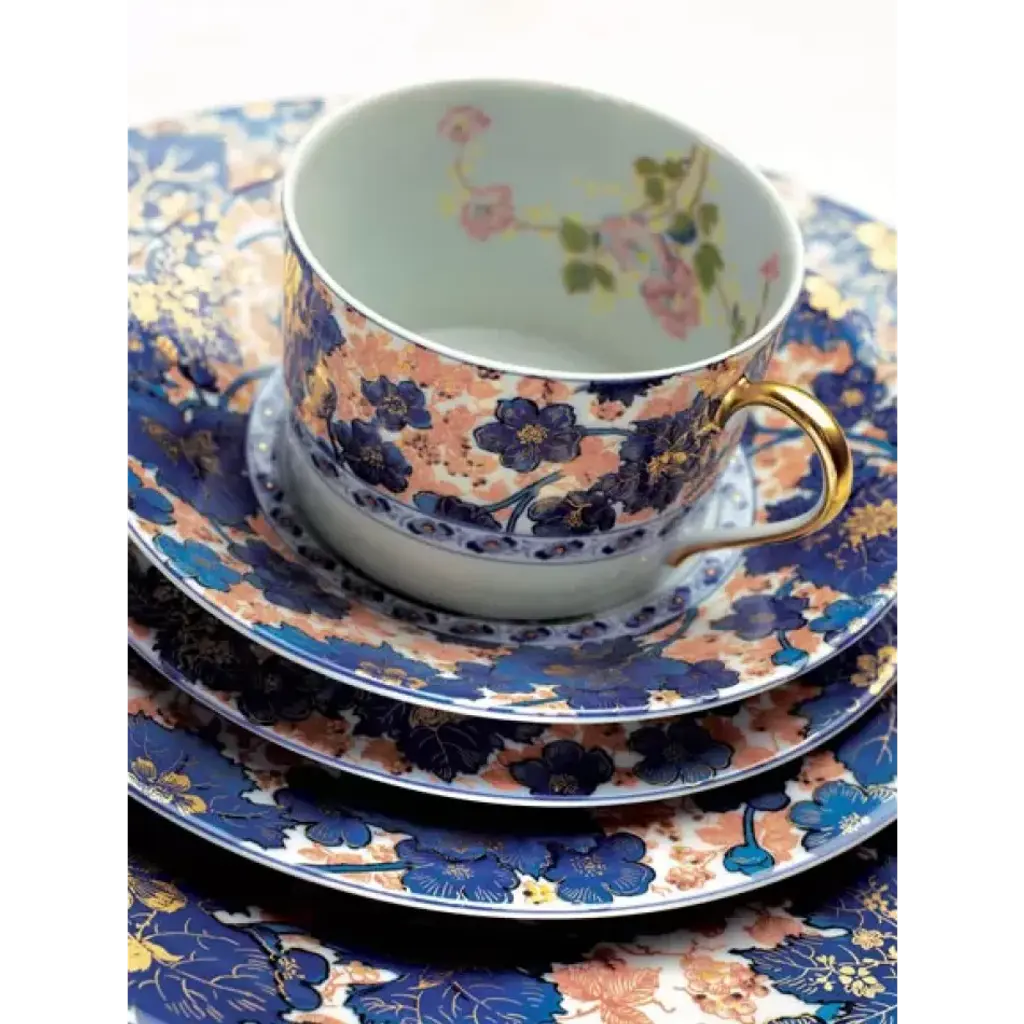 Brilliant blooms and gold are hand-painted on white Limoges porcelain for an unforgettable dinnerware collection from Haviland. Five piece place setting includes dinner plate, salad/dessert plate, bread & butter plate, teacup and saucer. Haviland Porcelain was founded by David Haviland, an American who moved from New York to France after he was brought a broken tea cup to match and recognized the quality and color of the old piece of porcelain. Filled with curiosity, he went to France to find the factory where the cup had been made, but the samples he was sent were not up to his standards. So in 1841, he moved to Limoges to set up his own factory. Traditional French dinnerware was usually produced in Limoges and sent to Paris for decoration. Haviland insisted on setting up a studio within his factory to have more control over the designs. Renowned artists, including Cocteau, Dali, and Kandinsky have played a role in the company's designs. Today, Haviland is one of the premier names in French porcelain dinnerware, sought by collectors all over the world. Clients have included the White House, Empress Eugenie, General de Gaulle, Jacques Chirac, the Emperor of Japan, and the Royal Court of Morocco.