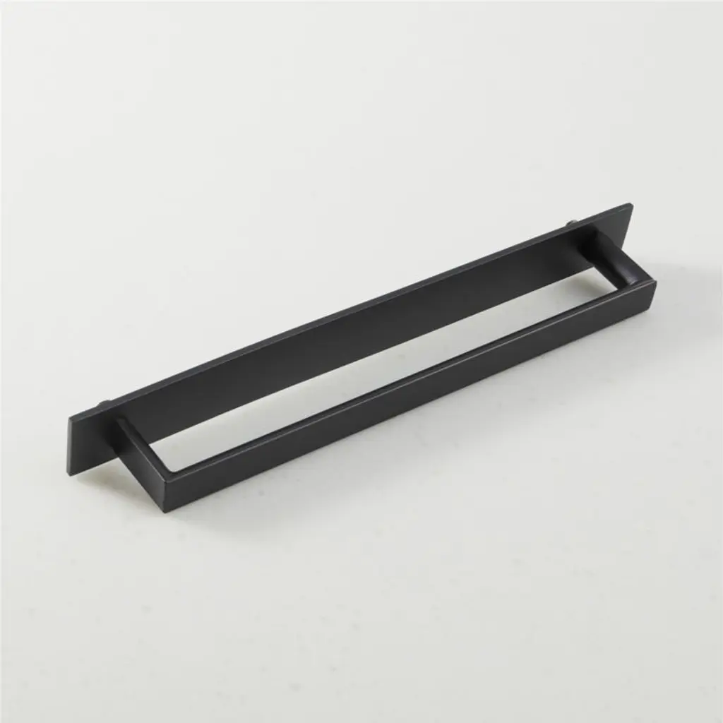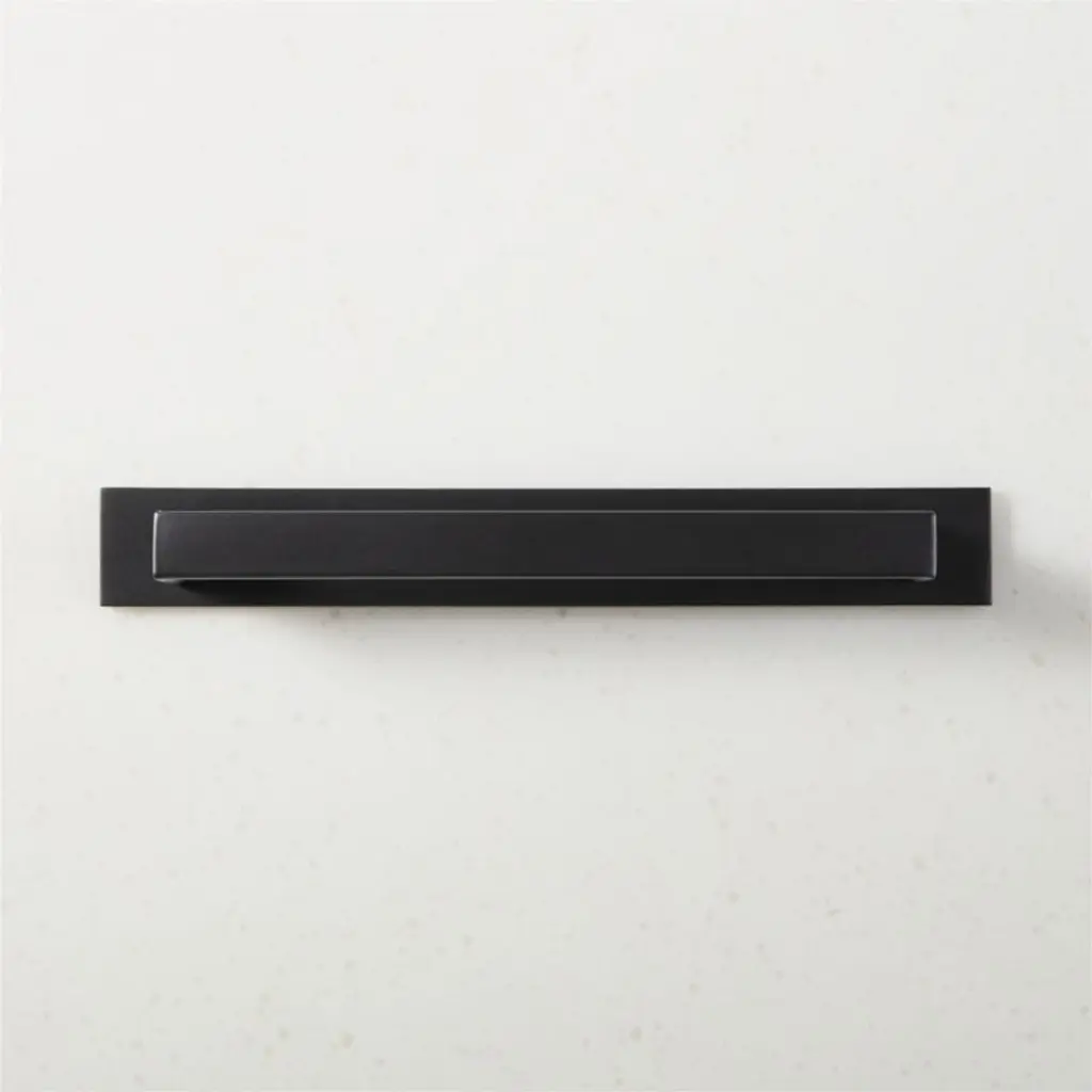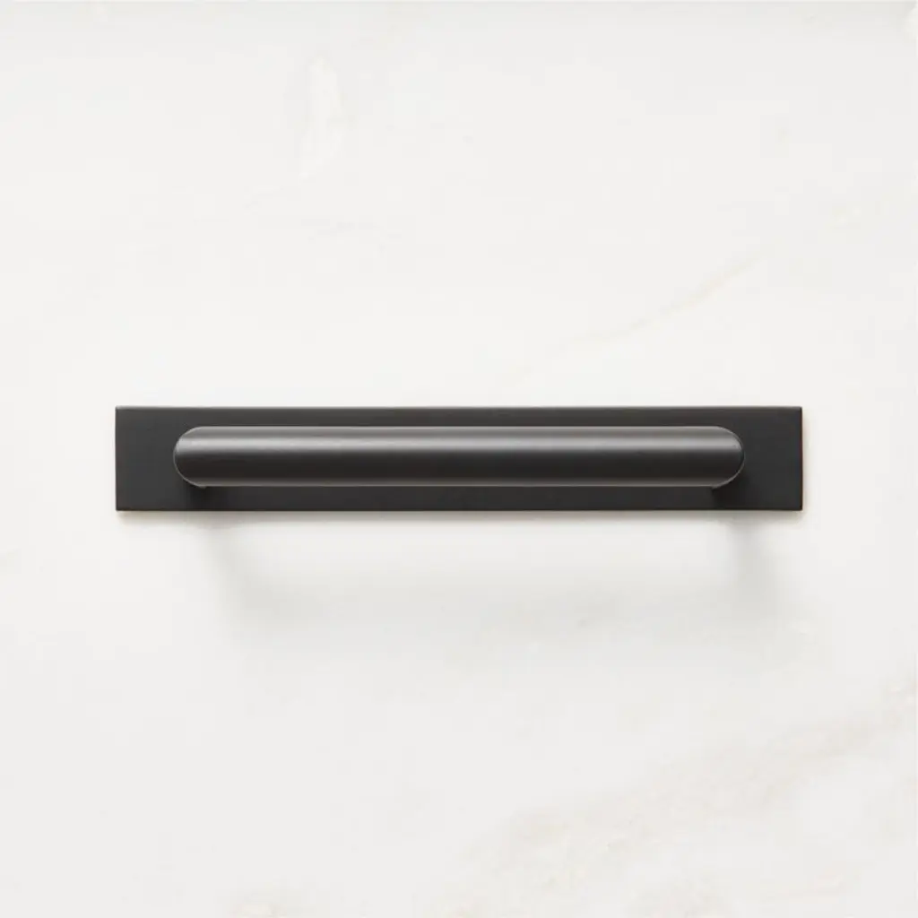 Barcelona-based Mermelada Estudio's cabinet handle and coordinating backplate sport sleek lines and subtle curved details, crafted of solid brass in a matte black finish that elevates any space. Learn about Mermelada Estudio on our blog. CB2 exclusive.