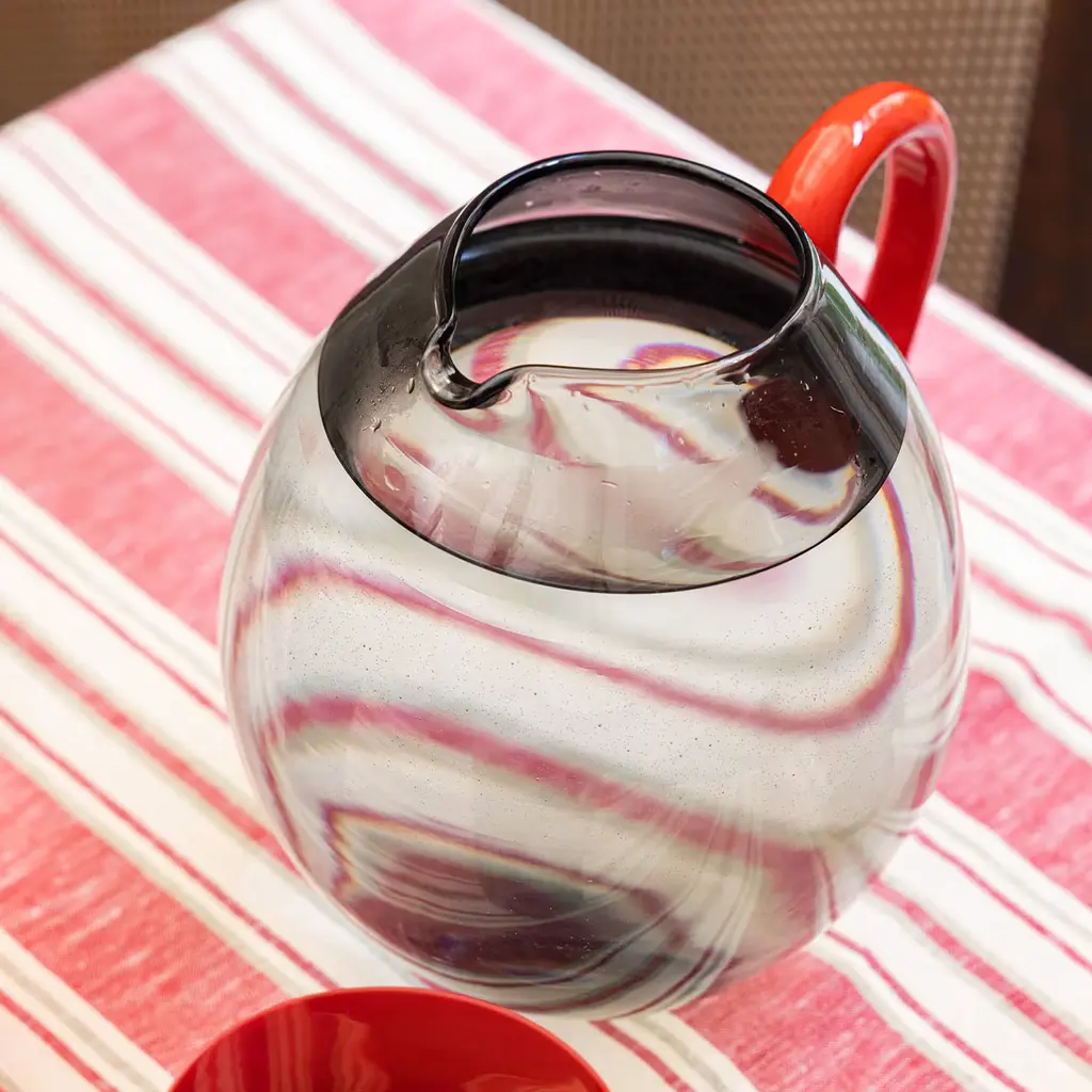Ideally complementing refined modern tables seeking a pop of color, this one-of-a-kind pitcher is one of the precious mouth-blown Murano glass pieces part of the Dandy Collection. The bright coral shade of its curved handle enlivens the elegant gray transparency of its bulging silhouette, which features a discreet spout along the rim. Finished by hand, each piece is unique.