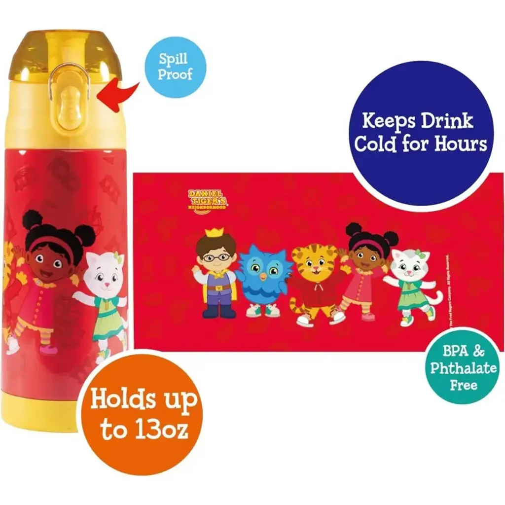 Daniel Tiger 13 Oz Insulated Water Bottle With Latching Lid - Easy To Use For Kids - Reusable Spill Proof, Keeps Drinks Cold For Hours, Fits In Lunch