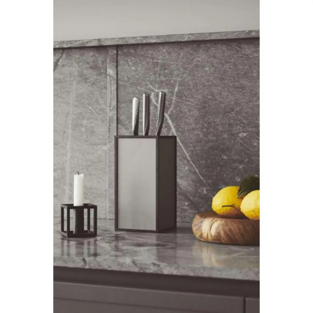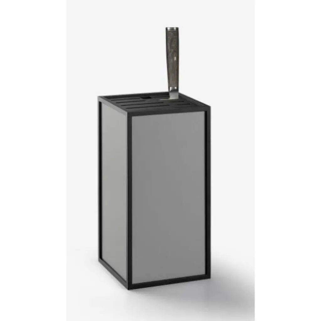 Dark grey k’block knife box by LassenDimensions: D 12 x W 12 x H 24 cm Materials: Metal Weight: 1.90 KgK’Block is a statement piece in your interior design, that catches the eye and turns an otherwise commonplace item into an interesting design object in your kitchen. The minimalist block can be used for a variety of purposes, and the removable insert lets you store your knives for easy access while you cook. If the insert is removed, you will have a beautiful container for ladles and other cooking implements, that you can keep next to the stove.K’Block is designed with inspiration from the sleek expression of the Kubus candleholder. The box itself is made from CDF and melamine, which makes the knife holder water-resistant to any watermarks, that may occur. The removable insert can also be put into the dishwasher, which makes the block easy to clean. K’Block comes with 4 field pads, that can be placed under the bottom of the knife holder to avoid scratches in e.g., the tabletop.K’Block will look beautifully in combination with by Lassen’s Frame boxes, Roll’In or the iconic Kubus Vases, that also can be used for your kitchen items.By Lassen is a Danish design brand focused on iconic designs created by Mogens and Flemming Lassen, founded by Lassens’ relatives in 2008. Brothers Mogens (1901-1987) and Flemming (1902-1984) Lassen are known as two of Denmark’s greatest architects and designers. Both were renowned pioneers of Danish functionalism and modernist architecture, honoured with numerous prestigious medals and awards. Headed by Mogens Lassen’s grandson Søren Lassen, By Lassen carries on the brothers’ design philosophy by manufacturing their iconic designs as well as products by other designers that complement the Lassen’s functionalist style. The company’s mission is to continue the tradition of timelessness, functionality and quality, and to introduce the Lassen’s design heritage to new generations.