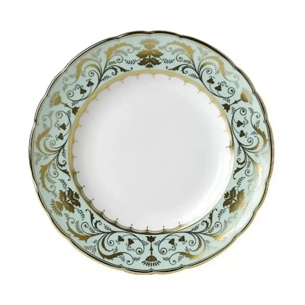 Darley Abbey captures the Regency style of restrained simplicity, using delicate lines and intricate curves to represent twirling foliage and filigree leaves. The ornamental gold elements combined with a soft green damask background makes the pattern dance around the tableware. Made in England by Royal Crown Derby. The Royal Crown Derby Porcelain Company manufactures the highest quality English fine bone china and collectibles at its headquarters in Derby, England (the English Pottery district). Although the present factory was established in 1878, the original factory was set up nearby in Nottingham Road in 1750. Queen Victoria granted permission to include the title "Royal" in the company name in 1890.