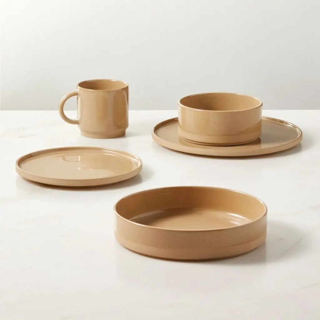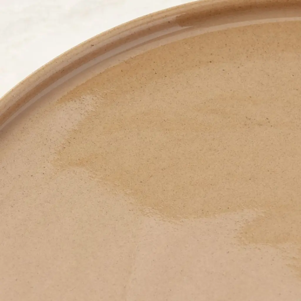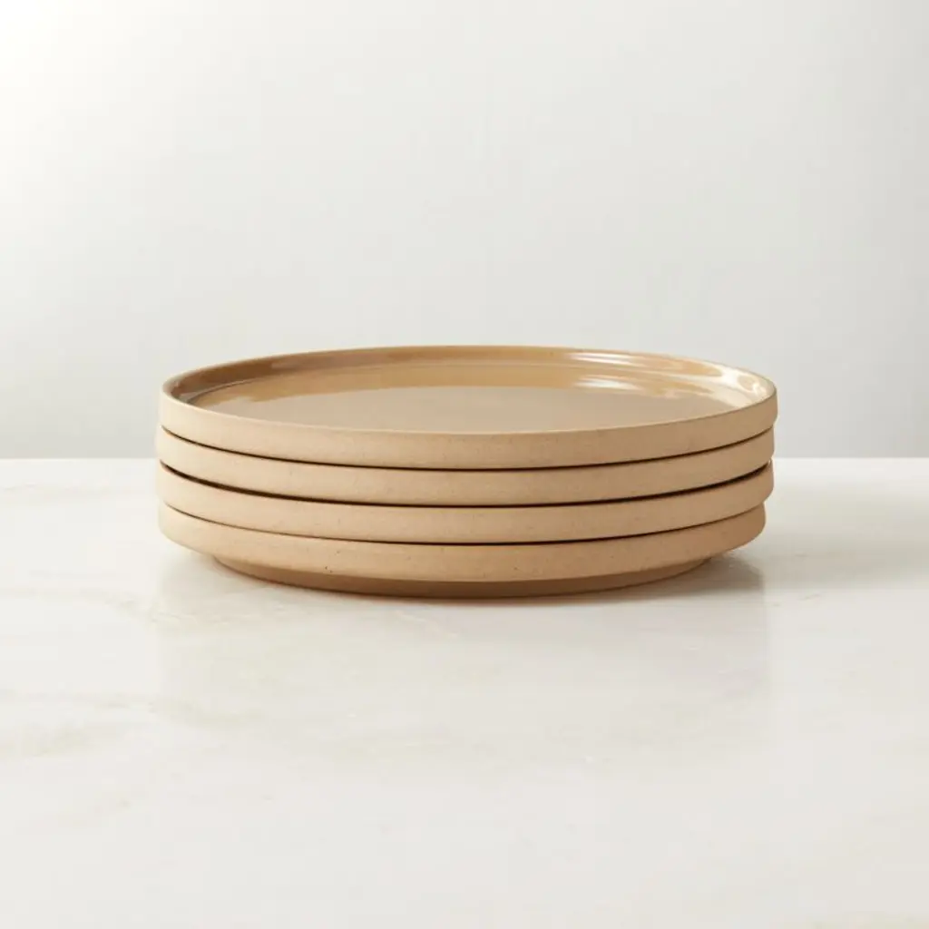 Sand-colored recycled stoneware sets a refined yet relaxed table in a natural palette. Crafted in Portugal, the stackable salad plate is made of Ecogres, a proprietary clay composed of 90% recycled materials. Unglazed on the exterior for a naturally tactile finish, the interior features a high-gloss glaze that highlights subtle black flecks in the clay. CB2 exclusive.